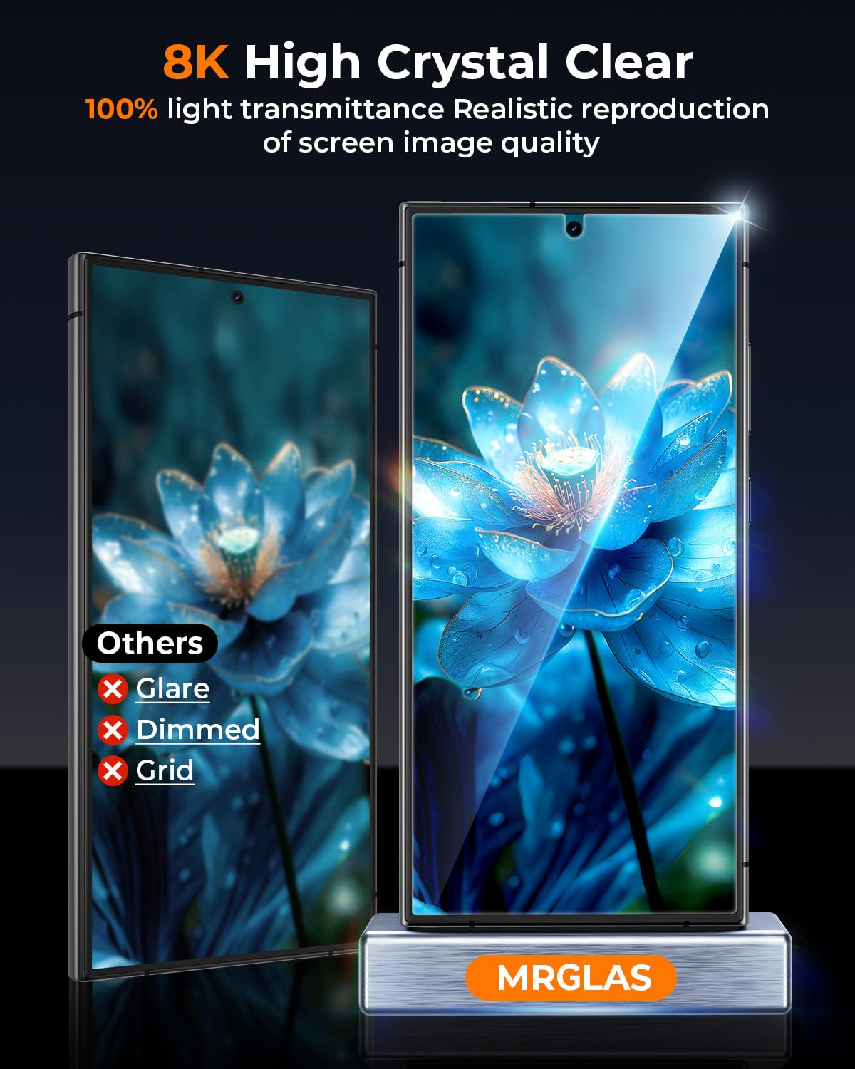 Q: What is the care and maintenance for the screen protector?A: To maintain the MRGLAS screen protector, simply clean it with a microfiber cloth to remove fingerprints and smudges. The hydrophobic and oleophobic coating reduces dust and oil adhesion, making it easier to keep clean and ensuring a flawless touchscreen experience.