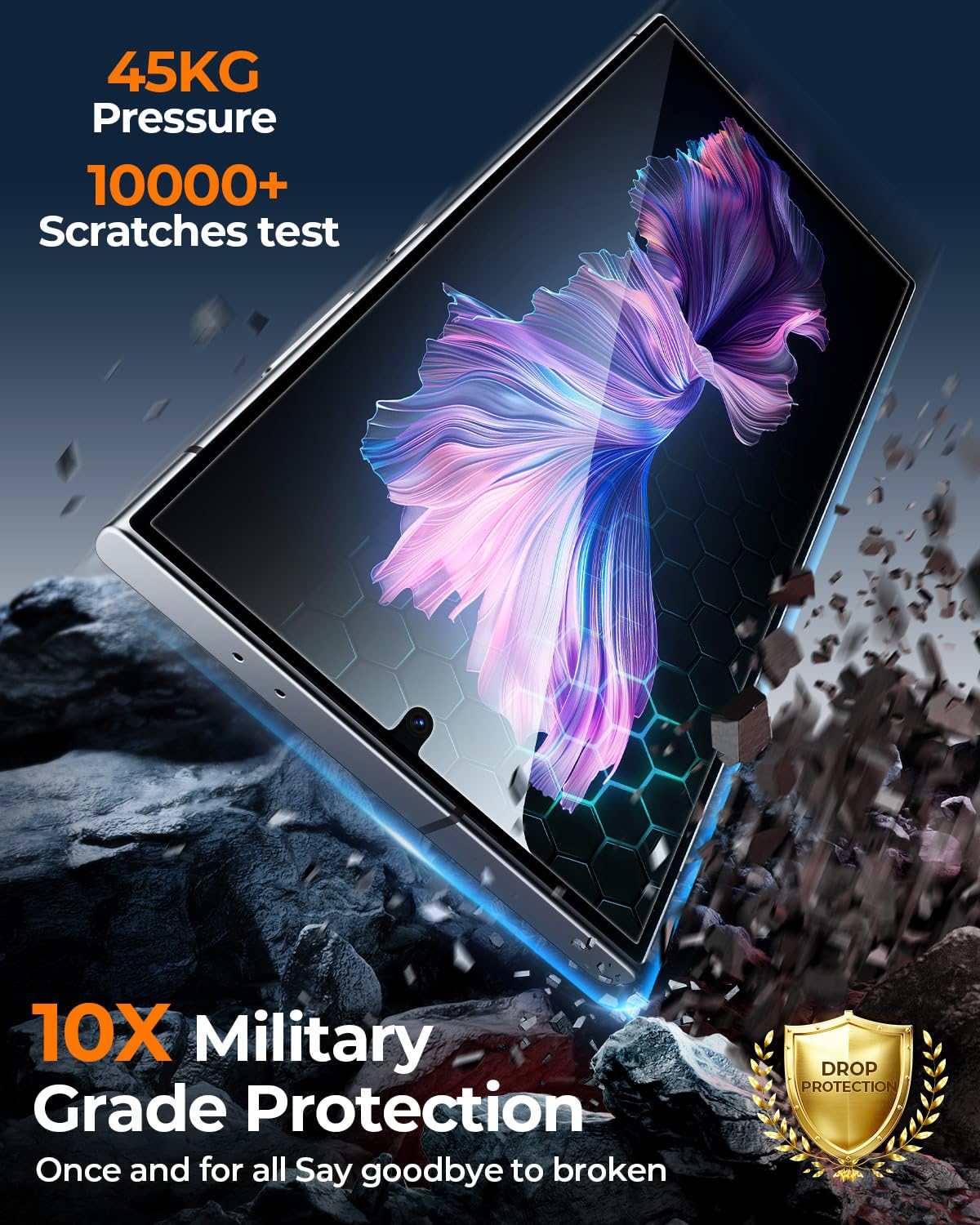 Q: What kind of protection does the tempered glass offer?A: The tempered glass screen protector provides 10X military enhanced protection, making it up to 4X stronger than traditional protectors. It effectively guards against impacts and compression, protecting your screen from damage under pressure of up to 45kg.