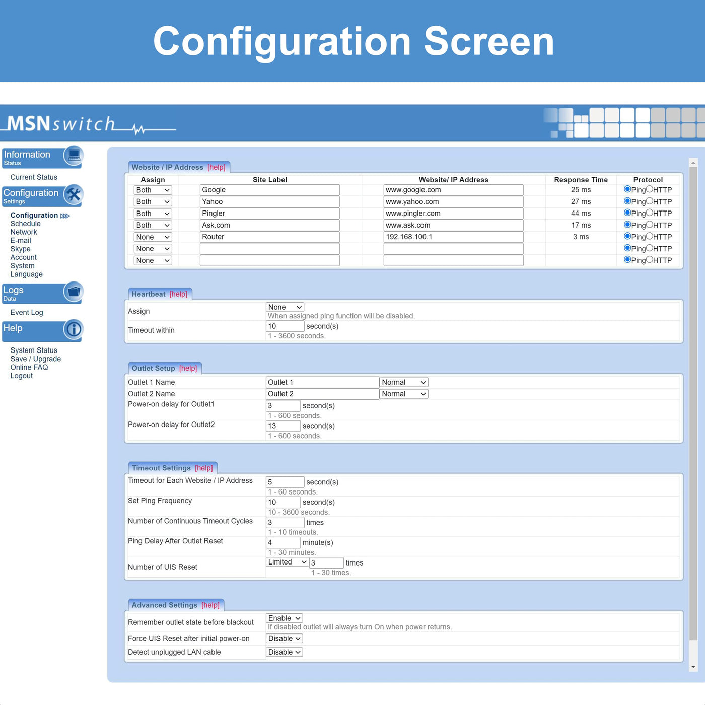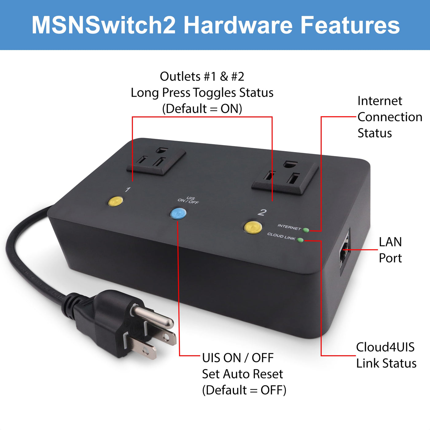 Model Uis-722B Is Identical To Model Uis-622B But Has A Faster Cpu.The Msnswitch 2 Can Power-Cycle Any Device When Internet Connectivity Is Lost. This Remotely Controlled Ac Power Switch Can Automatically Reboot Your Modem Or Router Without Anyone Present.Msnswitch Will Automatically Ping Up To 7 Different Preset Targets, Which Can Be Changed - If They Are Unreachable, Msnswitch Will Power-Cycle One Or Both Ac Outlets. Power Cycles Can Also Be Scheduled In Advance. Plus,You Can Control Everything From Your Smartphone!Pays For Itself With Just 1 Saved Site Visit!Features:• One Press Protect, No Internet Setup Required• Functional Out Of The Box!• Maintain A Continuous Internet Connection By Resetting Power Outlets When Internet Freezes• Monitor Status, Control Outlets & Configure Device Remotely Via:&Nbsp; ◦ Ezdevice Smartphone App (Apple Ios & Android)&Nbsp; ◦ Cloud4Uis.Com Web Service&Nbsp; ◦ Web Browser&Nbsp; ◦ Skype & Hangouts&Nbsp; ◦ Http Api• Option To Ping Lan Ip Or Wan Ip• Scheduled Outlet Power Cycles - 20 On/Off At Day/Time Events• Countdown Power-Cycling - Automatically Power Cycle Outlet Power Every X Mins (1-1440)• Heartbeat Monitoring - Reset One Or Both Outlets If The Msnswitch Does Not Receive A Heartbeat Packet• Dynamic Dns Support & Remote Admin• E-Mail Alerts - Notify Multiple Users Of Various Events• Advanced Network Configuration - Dhcp Or Static Ip Address, Dns Servers And Http Web Admin Interface Port• Save/Restore Configuration - Easily Copy The Configuration To Multiple Units