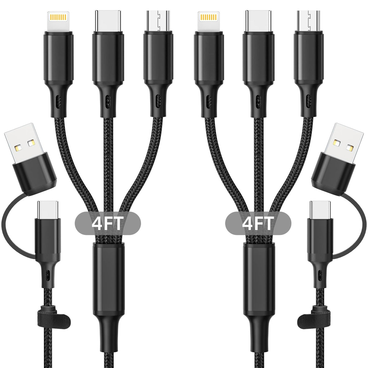 Q: How long is each cable in the pack?A: Each cable in the Multi Charging Cable 2Pack measures 4 feet in length, making it convenient for use in various settings, whether at home, in the office, or while traveling.