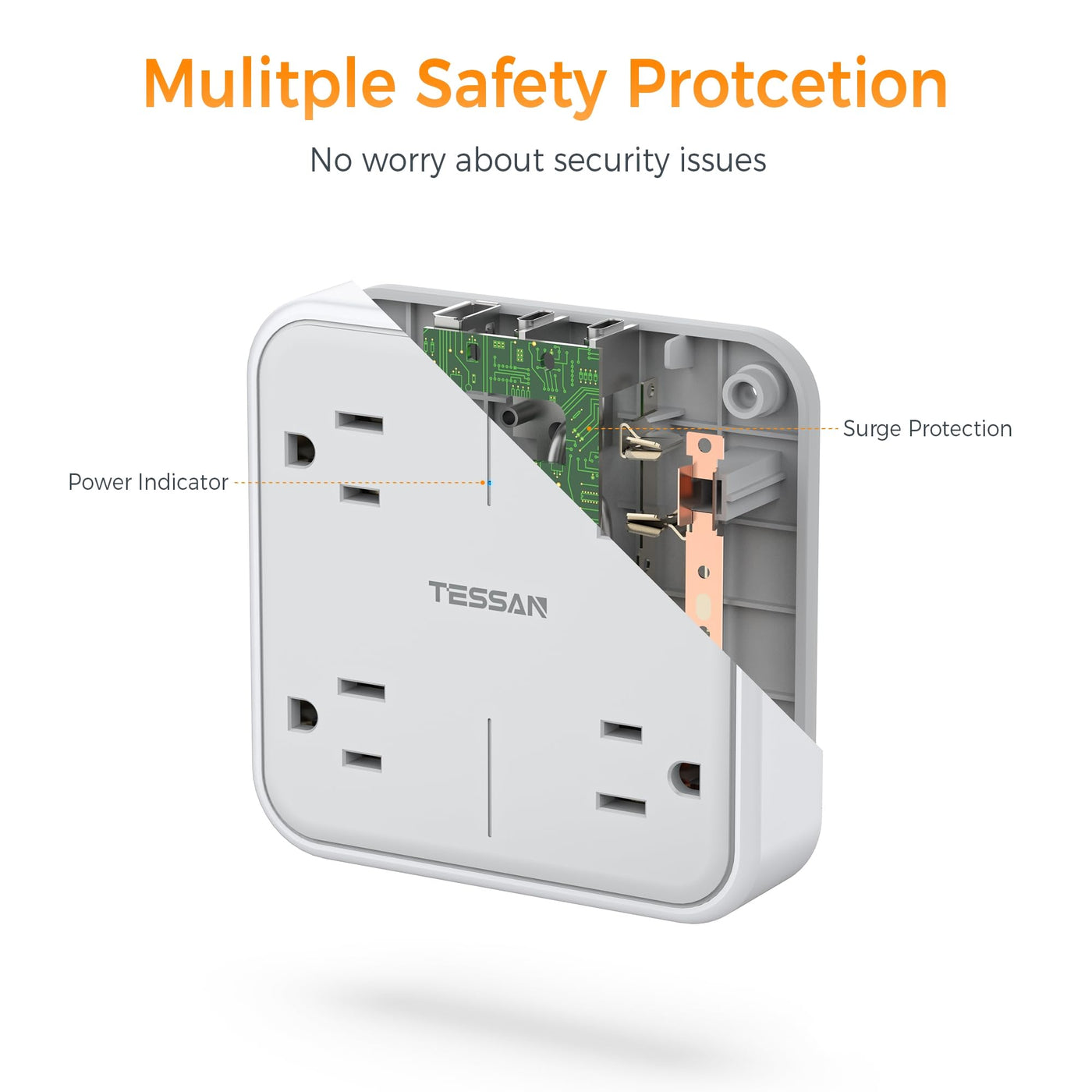 Q: Is the TESSAN Multi Plug Outlet Extender safe to use with sensitive electronics?A: Yes, the TESSAN Multi Plug Outlet Extender is equipped with surge protection, which safeguards your home or office electronics from power surges and spikes, ensuring a safe and reliable charging environment.