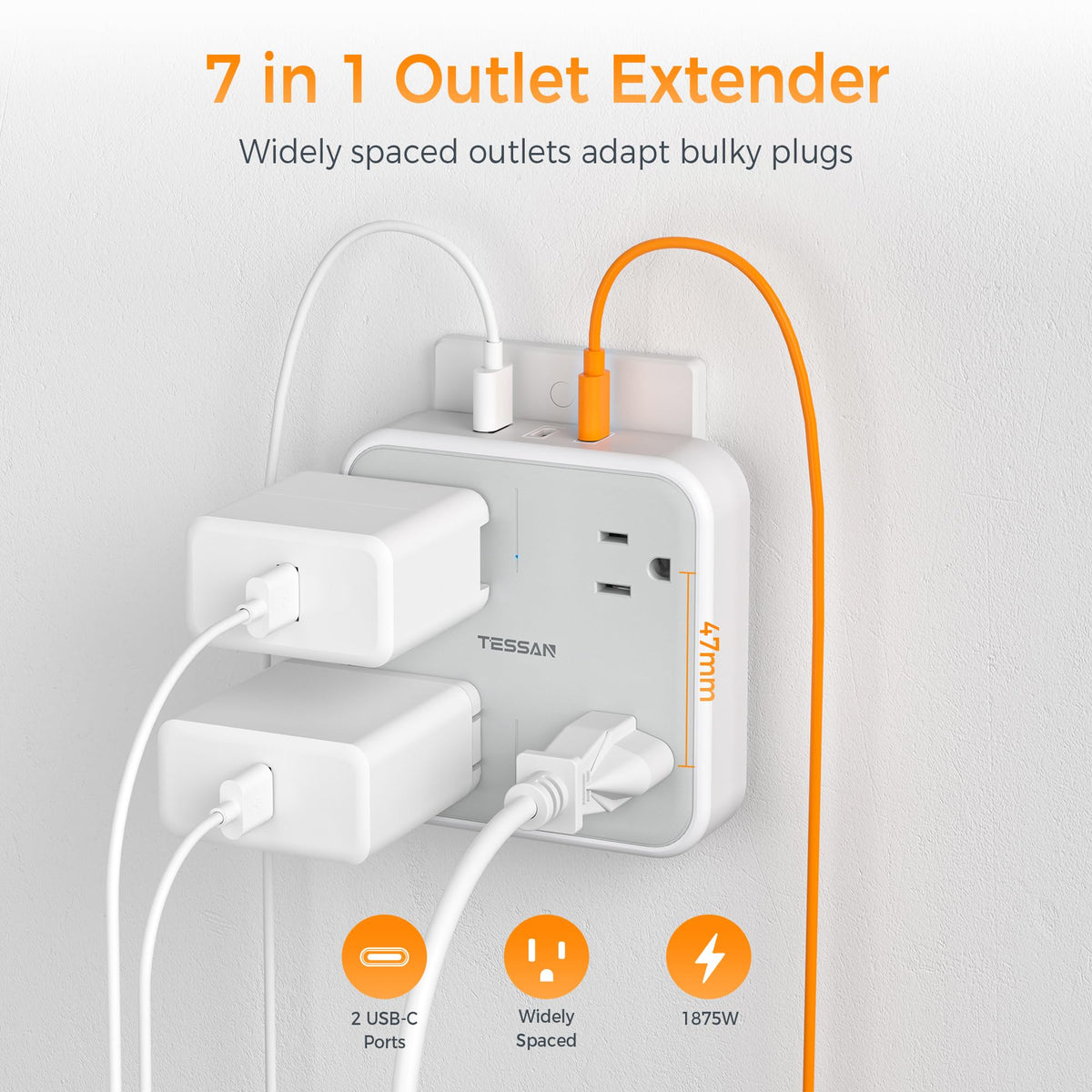 Multi Plug Outlet Extender, Tessan Outlet Splitter 4 Outlets 3 Usb Wall Charging Ports (2 Usb C), Wide Spaced Multiple Expander