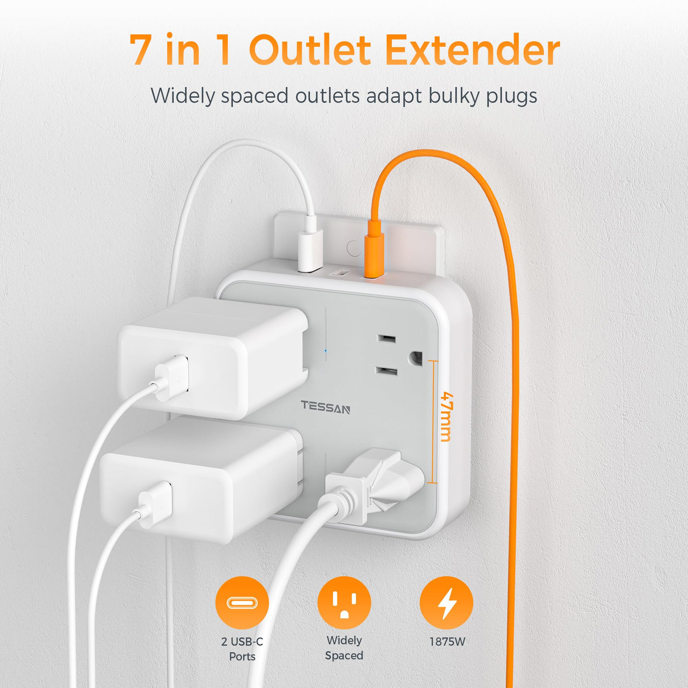 7 In 1 Multi Plug Outlet: Plug Extender Could Turn 1 Socket Into 4 Ac Outlets 3 Usb Ports, Can Charge 7 Devices At A Time Without Blocking, Cleaning Various Messy Cords And Taking Up Little Space At Your Home; You Can Use It In Any Indoor Place Such As Bedroom, Hotel, Office And College Dorm Room | Usb C Wall Plug: 2 Usb C Port Features 3A Max, Usb A Port Features 2.4A Max; 2 Types Of Usb Ports Can Detect Charged Devices And Deliver Optimal Charging Speed, Giving You More Charging Options; Ideal For Usb Devices Like Cell Phone, Tablet, Earphone, Etc; Note: The Ucb-C Port Doesn'T Support Any Other Devices Which Need 14 To 22V Charging Voltage | Widely Space Outlet Extender: With The Dimension Of 3.9 X3.9In, The Triple Plug Is Easy To Store; Compact Design Multiplug Wall Outlet Can Fit 4 Big Plugs Together Without Blocking Each Other, Cleaning Various Messy Cords And Taking Up Little Space At Your Home; Makes It Easier To Use Various Equipment In Any Place With Limited Sockets | Surge Protector & Superior Safety: Equipped Surge Protection Can Protect Your Home/Office Electronics From Surges And Spikes Disturbances, Providing You With A Safe And Reliable Charging Environment | Suitable For Any Occasions: This Multiple Plug Outlet Is Easy To Use, Apply For Any Indoor Place With Socket, Especially For The Living Room, Bedroom, Bathroom, Kitchen, Hotel, Office And College Dorm Room