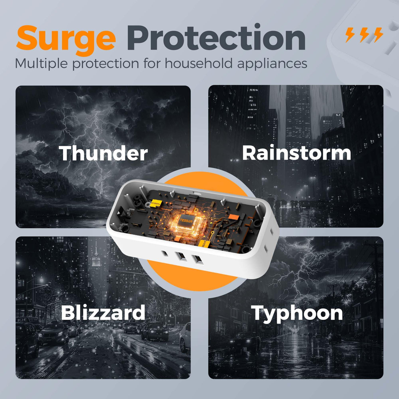 Q: What safety features does the surge protector provide?A: The TESSAN outlet extender includes multiple safety features such as overload protection, short-circuit protection, and over-current protection to safeguard your devices from surges and spikes.