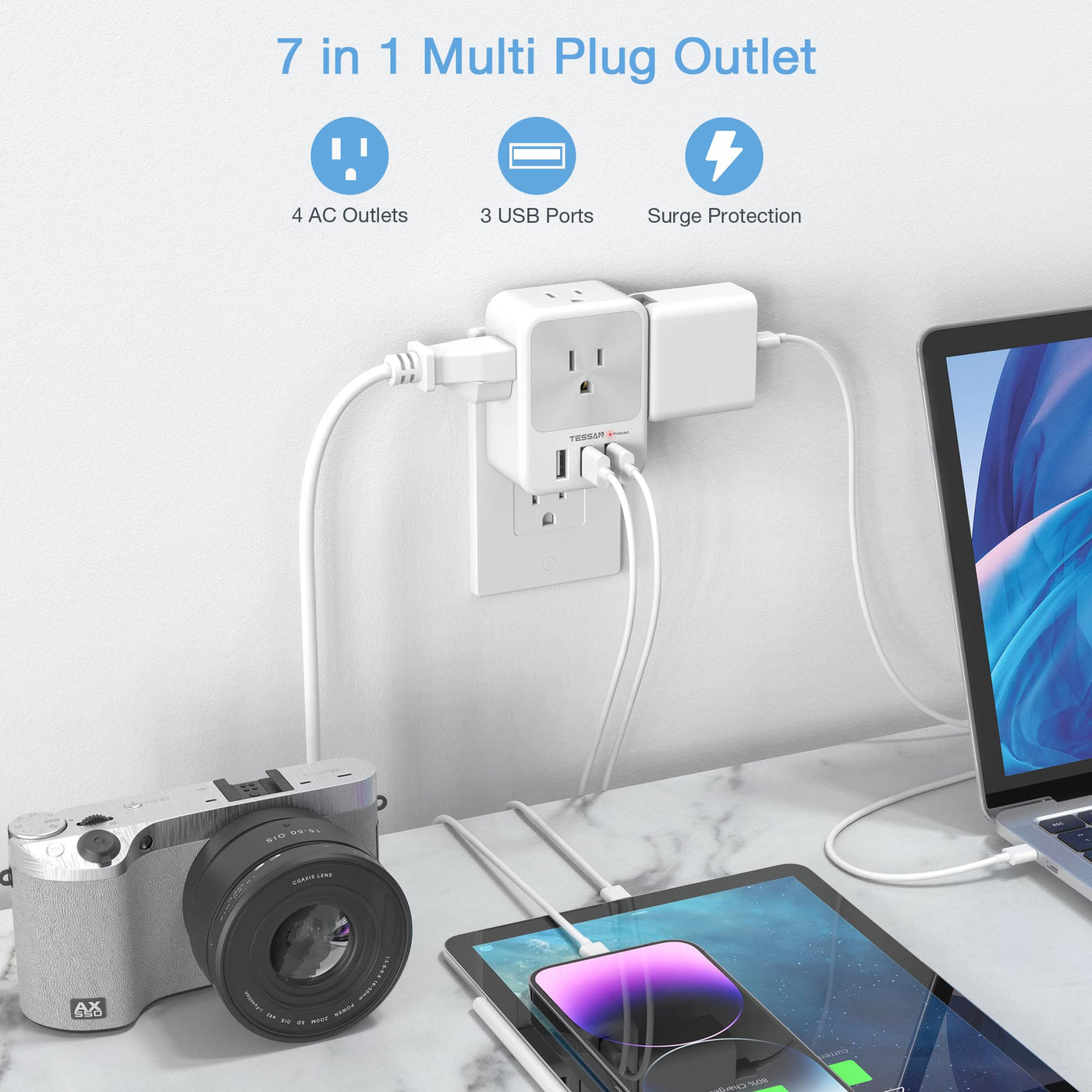 Q: How many devices can I charge simultaneously with the TESSAN Multi Plug Outlet Splitter?A: You can charge up to 8 devices simultaneously with the TESSAN Multi Plug Outlet Splitter, which includes 4 AC outlets and 3 USB ports.