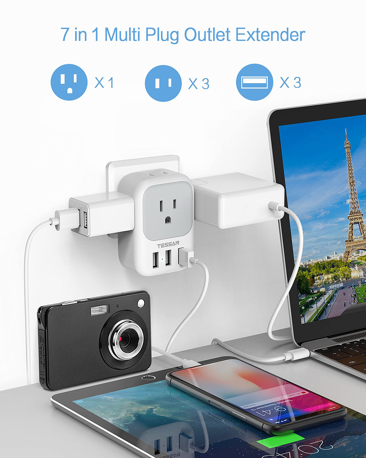 Q: How many devices can I charge with the TESSAN multiple plug outlet splitter?A: The TESSAN multiple plug outlet splitter can turn one socket into four electrical outlets, allowing you to charge up to four devices simultaneously. Additionally, it features three USB ports, enabling you to charge even more devices at the same time.