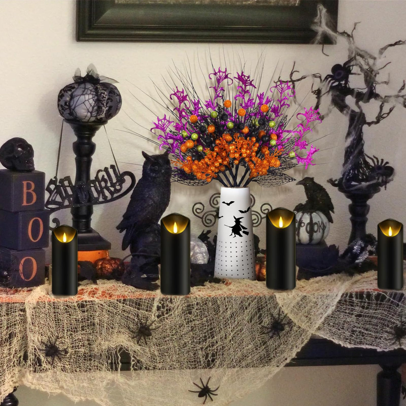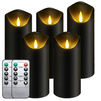 Set Of 5 Flameless Candles: The Package Contains 5 Pillars Candles, The Size Is D: 2.2 Inches, H: 5 Inches/5 Inches/6 Inches/6 Inches/7 Inches, Two 10-Keys Adjustable Timed Remote Controls. Each Candle Needs 2 Aa Batteries(No Included). | Multiple Functions:Our Black Led Candles Can Be Controlled Remotely With 10 Buttons To Adjust Light Intensity, Status And Time. You Can Set 2/4/6/8 Hours And Cycle At The Same Time Every Day. Flicker Or Steady Mode Meets Your Every Need And Gives You Maximum Control. | Beauty Candles: The Black Battery Operated Candles Are Designed To Be Safe And No Flame. We Are Made Of Healthy, Lightweight Plastic Materials With Stable Quality And No Need To Worry About The Risk Of Fire, Dripping Wax, High Temperature Melting, Creating A Good Atmosphere For You. Tips: Please Take Out The Battery If It Is Not Used For A Long Time. | Charming Black Color:Our Flameless Candle Is Designed In A Unique Black Color, Which Is Perfect For Holiday Decorations Such As Halloween, Black Themed Parties, Etc. The Flickering And Warm Lights Can Make Your Party Scene More Realistic And Charming. | Ideal Decoration: Flickering Candles Use Warm Yellow Light And Black Color Design To Create A Warm And Real Atmosphere, Suitable For Festive Dress Up, Garden, Birthday Party, Wedding, Bedroom And Other Scenes Decoration, Whick Also Can Be A Gift To Family And Friends