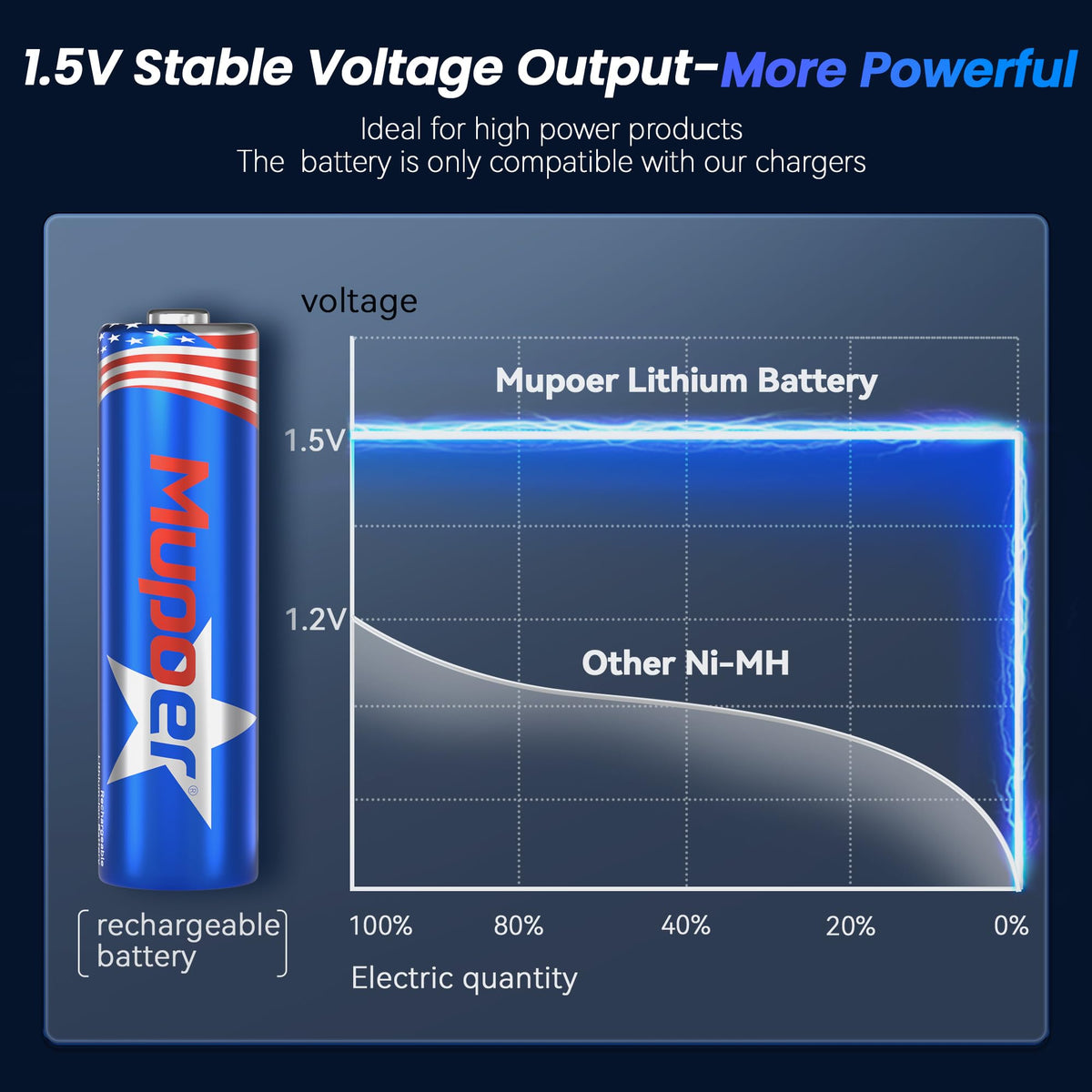 Q: What type of battery is the Mupoer Rechargeable AA Battery?A: The Mupoer Rechargeable AA Battery is a lithium-ion type. It provides a voltage of one point five volts, making it suitable for various electronic devices.