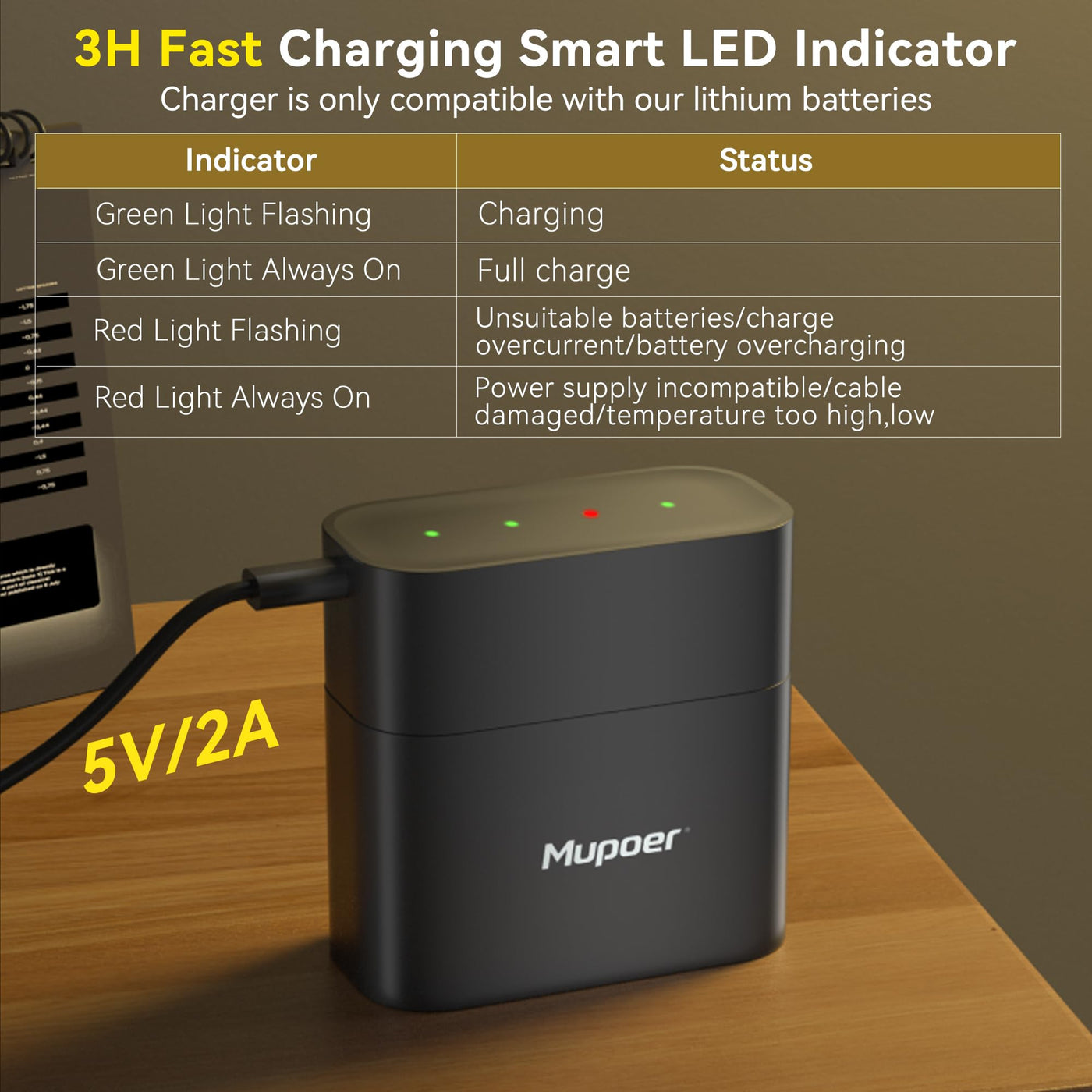 Q: What does the LED display indicate during charging?A: The LED display indicates charging status: flashing green for charging, static green for fully charged, and red for errors such as temperature issues or incompatible adapters.