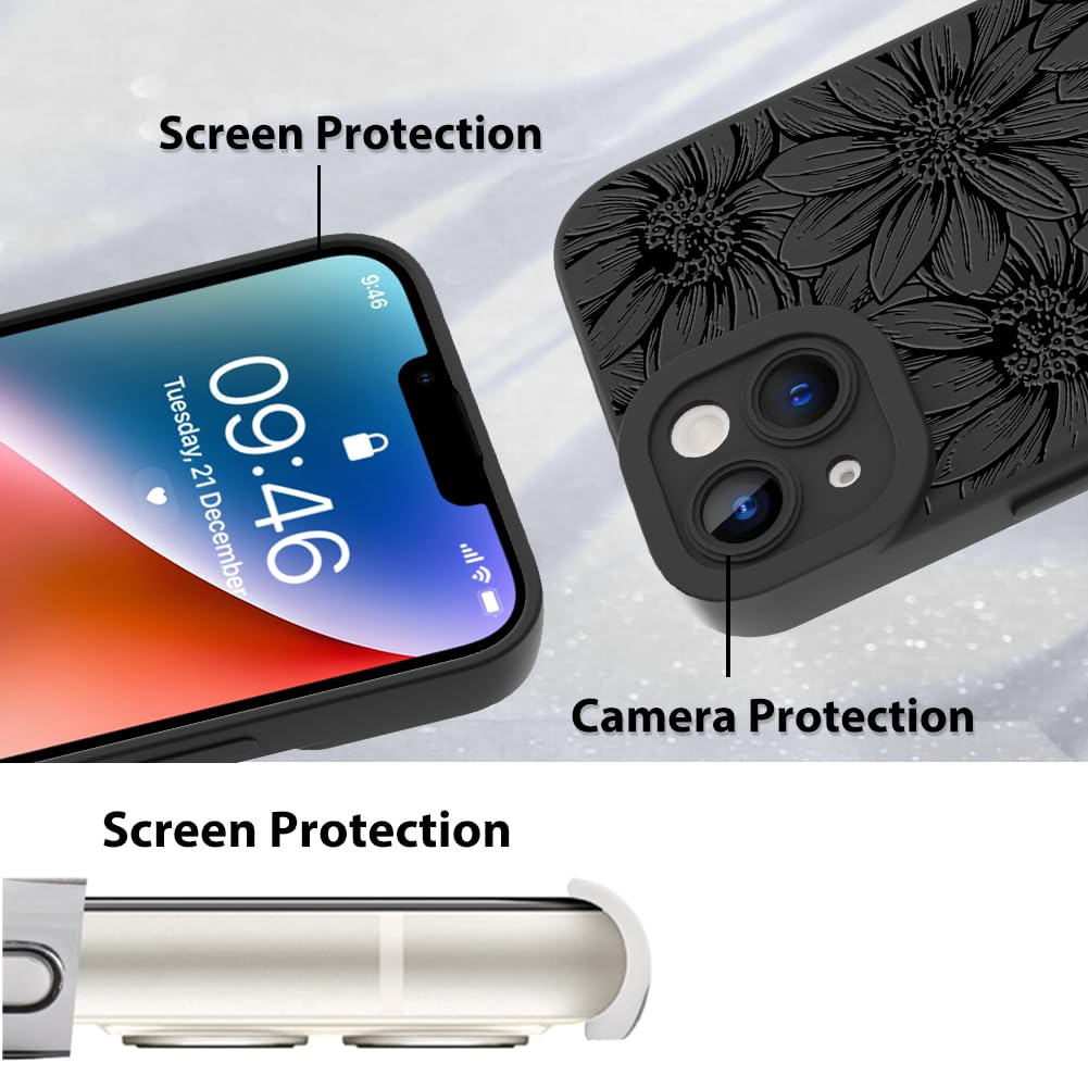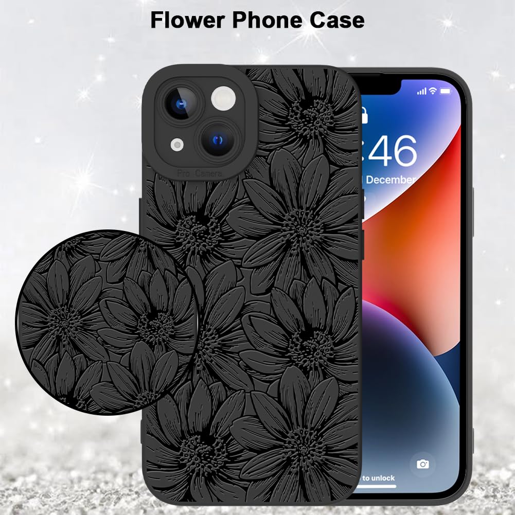 Mzelq For Iphone 14 Case, Silicone Black Floral Flowers Sunflowers Cute Pattern, Camera Protection Soft Slim Phone Case For Ipho