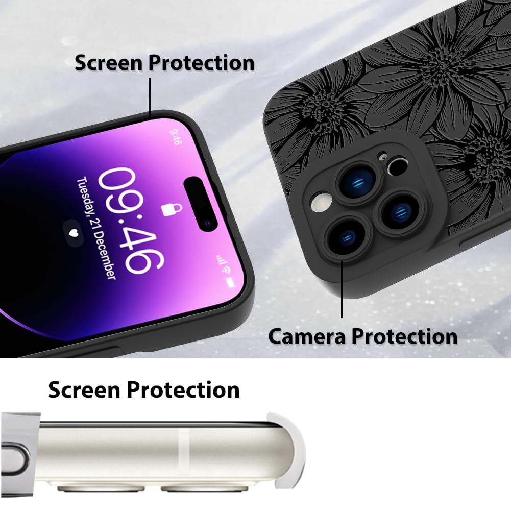 Mzelq For Iphone 14 Pro Max Case, Silicone Black Floral Flowers Sunflowers Cute Pattern, Camera Protection Soft Slim Phone Case