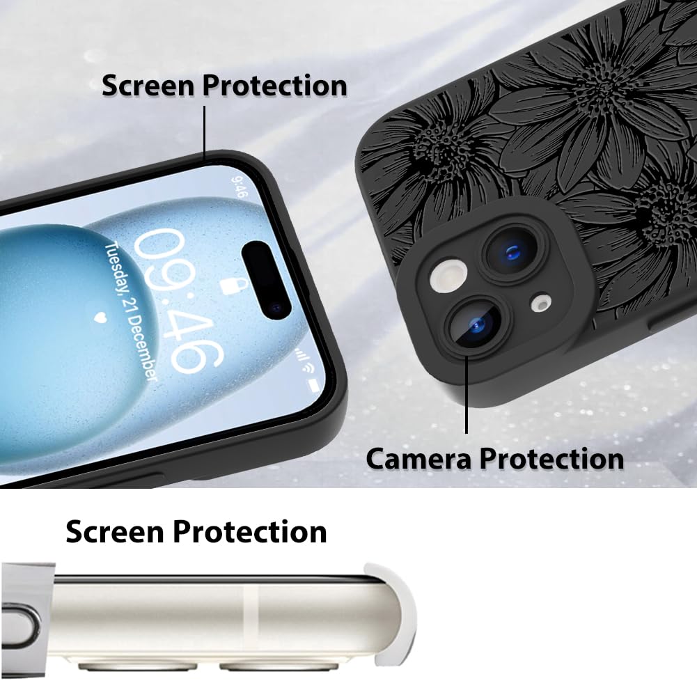 Mzelq For Iphone 15 Case, Silicone Black Floral Flowers Sunflowers Cute Pattern, Camera Protection Soft Slim Phone Case For Ipho
