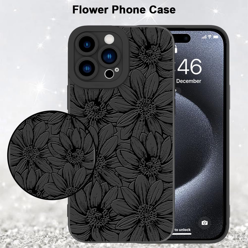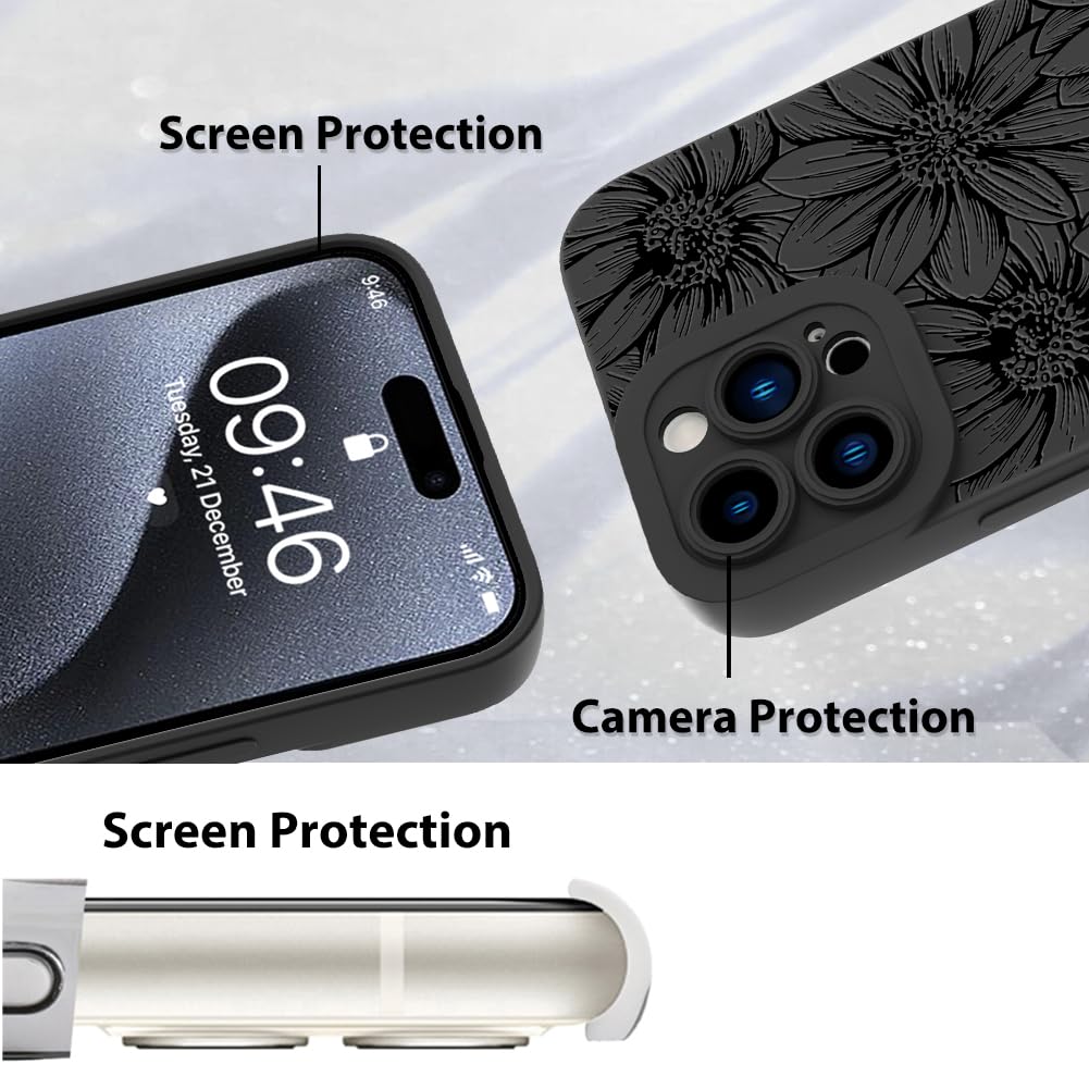 Mzelq For Iphone 15 Pro Max Case, Silicone Black Floral Flowers Sunflowers Cute Pattern, Camera Protection Soft Slim Phone Case