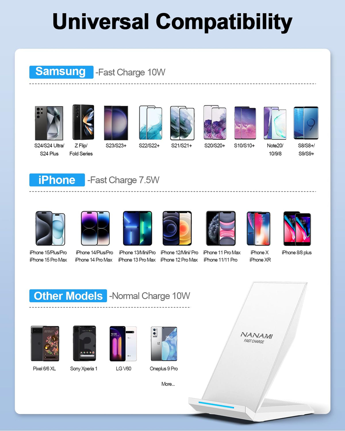 Nanami Quick Wireless Charging Stand Qi Fast Chargerenjoy Wireless Convenience, Farewell To Tangled Cable Messdevice Support Fast Wireless Charging-Samsung Galaxy S23/S23+/S23 Ultra/S22/S22+/S22 Ultra/S21/S21+/S21 Ultra/S20/S20+/S20 Ultra/Note 20/Note 20 Ultra/Note 10/Note 10 Plus/S10/S10 Plus/S10E,S9/S9 Plus, Note 9,S8/S8 Plus, Note 8, S7/S7 Edge, Note 5, S6 Edge Plusdevice Support Standard Wireless Charging:-Samsung S6, S6 Edge-Google Pixel 4/4Xl/3/3Xlnote:For Fast Charging, This Qc 2.0 Adaptive Fast Charger Is Required Qc 2.0 Or Above Adapter As Its Power Source. (Not Including The Ac Adapter)It Is Normal For Your Phone To Get Warm Or Even Warmer During Charging, And The Phone Cases Is Suggested To Be Removed During Charging.Features2 Coils - Portrait And Landscape Both Work Perfectly Fast Charge - 1.4~1.5 Times Faster Than Standard Wireless Chargeindependent Temperature Control - Separation Design, Reduce The Heat More Effectively Charger & Phone Bracket - Work As A Phone Stander Whatever Charging Or Notsmart Identification - Auto Detect And Charge At Max Speed Of Device From Standard/Fast Modebottom Curved Design- Provides Good Stability For Some Curved Phones And Decreases The Chance Of Droppingfast Charge Function1. The Fast Charge Feature Is Compatible With Only Samsung Galaxy S10 Plus/ S10 / S10E /S9 Plus/ S9/ S8 Plus/ S8/ S7 / S7 Edge / S6 Edge Plus / Note 9/ 8 /5 Models.2. Quick Charge Qc 2.0 Adapter (Output: 9V/1.8A) Is Required As Power Supply Of This Wireless Charger For Fast Charge Feature, Not Using Power Source From Computer, Because The Output From Computer Is Only 500-800Ma.What'S In The Box1 X Nanami Fast Wireless Charging Stand1 X Usb Power Cable (Not Including The Ac Adapter)1 X User Manualwarranty12-Month Warranty And A 30-Day Money Back Guaranty