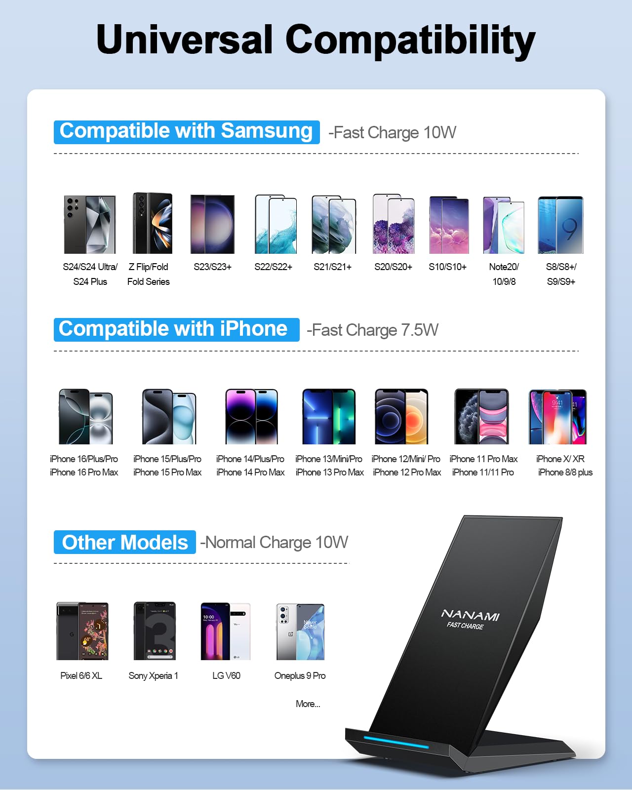 The Nanami Wireless Charger Is Packed With Two Charging Coils To Enable Freely Placement No Matter In Horizontal Or Vertical Positions. For Your Qi Devices Quick Charging Experience, Nanami Wireless Charger Stand Is The Premier One For Home Or Office. The Nanami Wireless Charger Offers 1.4 Times Faster Charging Due To Its Built-In Two Coils. This Enhances The Charging Experience Of The 2.0 Wireless Charging Stand As It Takes Less Time To Charge The Phone To Full Battery. With Unique Sailing Design, You Can Charge Your Phone In Vertical Or Horizontal Position And It Can Charge Straight Through Most Phone Cases Of Different Materials Likes Rubber, Plastic, Hybrid, Tpu, Pc Of Thickness Within 5Mm. It Also Perfectly Designed To Offer Face Id, Keeping Track Of Your Messages, Play Movies And Music Without Interrupting While Charging. You Can Also Attend Calls Without Unplugging Your Device. Product Specifications: - Connectivity Technology: Usb - Special Feature: Wireless Charging, Fast Charger - Connector Type: Usb - Total Usb Ports: 1 - Wattage: 10 Watts - Color: Elegant White - Power Source: Fuel Cell 2 Wireless Charging Modes And Compatibility: The Nanami Wireless Charger Offers 2 Charging Modes Of 10W Fast Charging And 7.5W Standard Charging. - 10W Fast Charge Model Is Compatible With Galaxy S24/S24+/S24 Ultra/S23/S23+/S23 Ultra/S22/S22+/S22 Ultra/S21/S21+/S21 Ultra/S20/S20+/S20 Ultra/S10/ S10 Plus/ S10E/ S9/ S9 Plus/ S8/ S8 Plus/ S7/ S7 Edge/ S6 Edge Plus And Note 20/20 Ultra/10/10 Plus/9/8/5 - 7.5W Standard Charge Model Is Compatible With Iphone 13/13 Mini/13 Pro/13 Pro Max/12/12 Pro/12 Pro Max/11/11 Pro/11 Pro Max/Xs/Xr/X/Xs Max/8/8 Plus. Please Note That Some Devices May Require Additional Wireless Charging Receiver. Safe Charging Protection: The Nanami Wireless Charger Is Ul, Fcc, Ce, Rohs Certified Featuring Over-Temperature Protection, Over Charging Protection, Over-Current Protection, Short Circuit Protection And Other Multiple Safety Protection Ensuring Full Safety Of Your Device. Please Note That A Blue Led Indicator Will Flash At The 1St Time If Your Phone Is Not Properly Aligned Or Any Foreign Objects Detected. Package Includes: The Wireless Charger Comes With 5V 2A Adapter To Provide The Best Charging Experience. This Nanami Wall Charger Usb Charging Adapter Is Also Compatible With Any Device That Supports Usb Charging Making It Universal And A Good Choice.