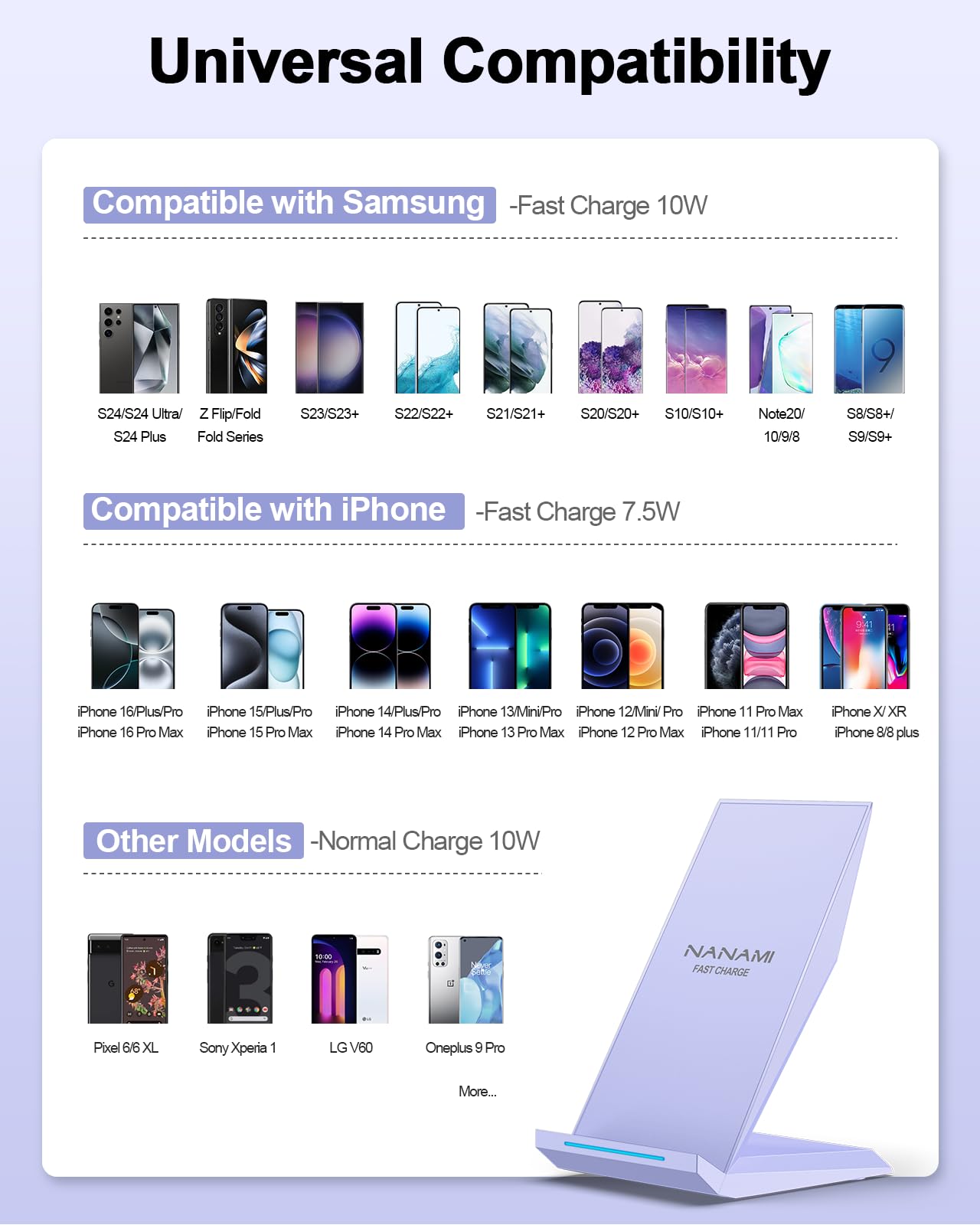 Q: What devices are compatible with the NANAMI Wireless Charger?A: The NANAMI Wireless Charger is compatible with a variety of devices. It supports 10W fast wireless charging for Samsung Galaxy S25/S24/S23/S22/S21 models and 7.5W fast charging for iPhone models including iPhone 16, 15, 14, and previous versions down to iPhone 8. Additionally, it offers standard 5W charging for other Qi-enabled devices.