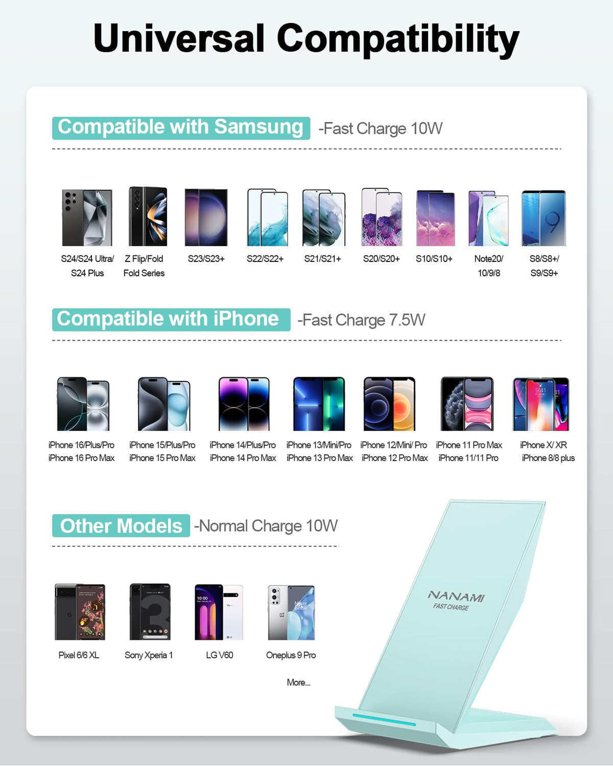 Q: What devices are compatible with the NANAMI Wireless Charger?A: The NANAMI Wireless Charger supports a variety of devices including Samsung Galaxy S23/S22/S21/S20 series, Note 20/10/9, and iPhones from 8 to 16 Pro Max. It also charges Qi-enabled devices, though some older models may require a wireless charging receiver.