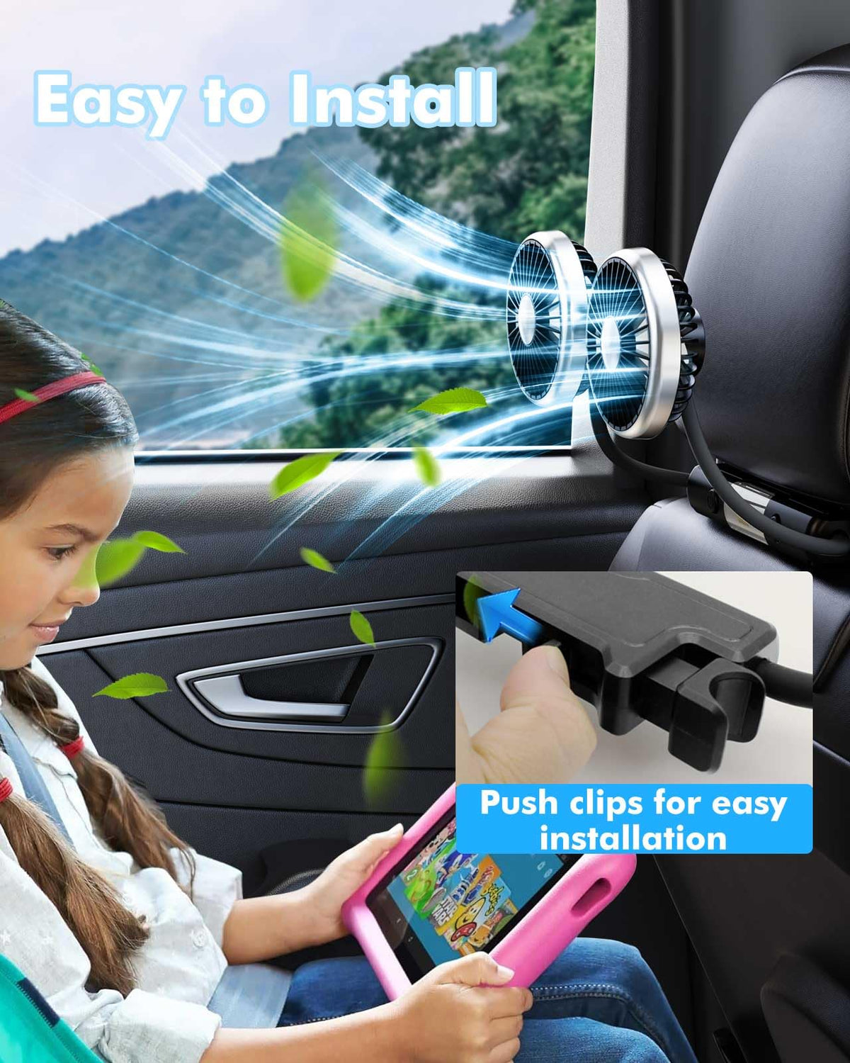 Q: How do I install the Nauttxon car fan, and is it easy to set up?A: Installation of the Nauttxon car fan is straightforward. It features a spring clip mechanism that allows you to simply clip the fan to the headrest bar, making it easy to set up without any tools.
