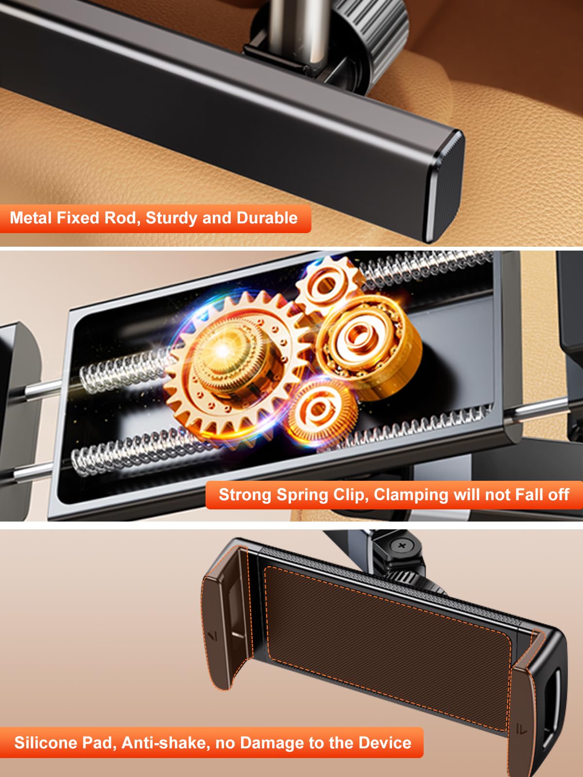 Q: What materials are used in the construction of this tablet holder?A: The nediea Headrest Tablet Holder is made from durable materials, featuring a sturdy metal fixed rod and strong springs with anti-slip pads, ensuring a secure grip on your tablet and longevity of use.