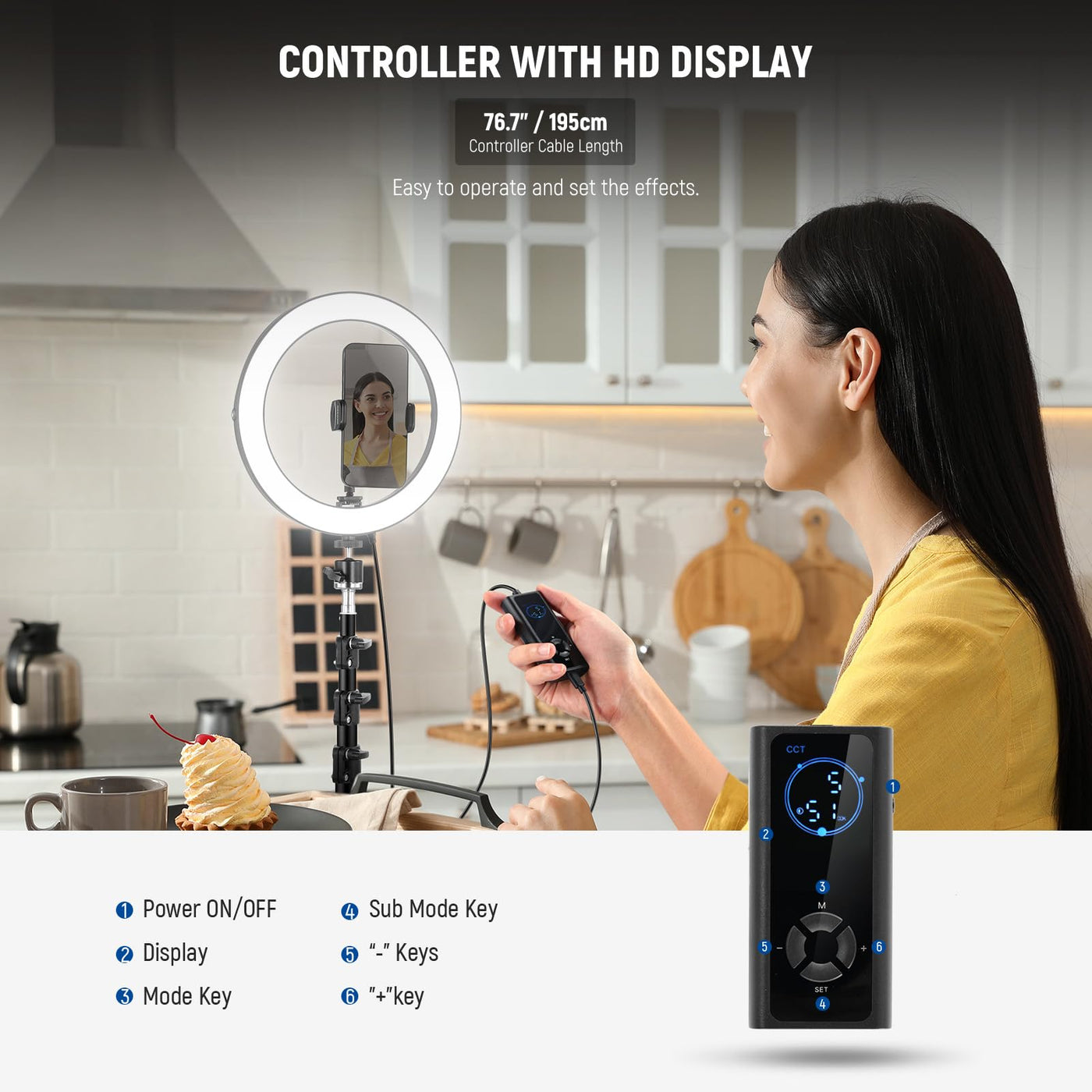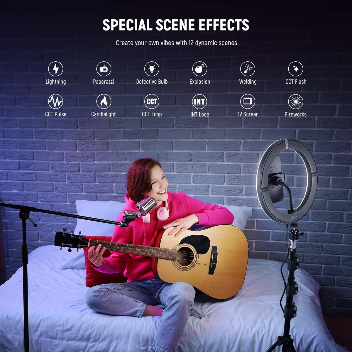 ?20W Powerful Bi Color Ring Light? A 20W Powerful Circle Ring Light As Key Or Fill Light For Makeup, Artist Esthetician Lash Eyelash Extension, Tattoo, Video Recording Lighting, Streamer Live Streaming, Computer Zoom Calls, Photoshoot, Selfies, And To Film Tiktok Social Media Vlog. 168 Leds (84 Cool White & 84 Warm White), 0-100% Dimming, 1660Lx/0.5M Illuminance, And Cri 97+/Tlci 98+ Produces A Bright, Or Soft, Diffused, And Even Light Source With Impeccable Color Accuracy | ?Cct & Fx Scene Effect Modes? Cct Mode Offers 2900K-7000K Warm And Cool Lighting Along With 0-100% Dimming. The Flexibly Adjustable Lighting Can Flatter All Skin Tones, Brighten Your Face, And Minimize Blemishes. Fx Mode Brings 12 Realistic Scene Effects For Professional Video Shooting. Use The Wired Controller To Quickly Get The Effect You Want | ?Reversible Metal Light Stand? The Supplied Portable Light Stand With A 21-71/54-180Cm Height Adjustment Range Can Place The Professional Standing Big Ring Light Overhead Or At Eye Level. The Stand Legs Can Fold Upward And Fit Inside The Carry Bag For Effortless Storage And Transportation | ?360