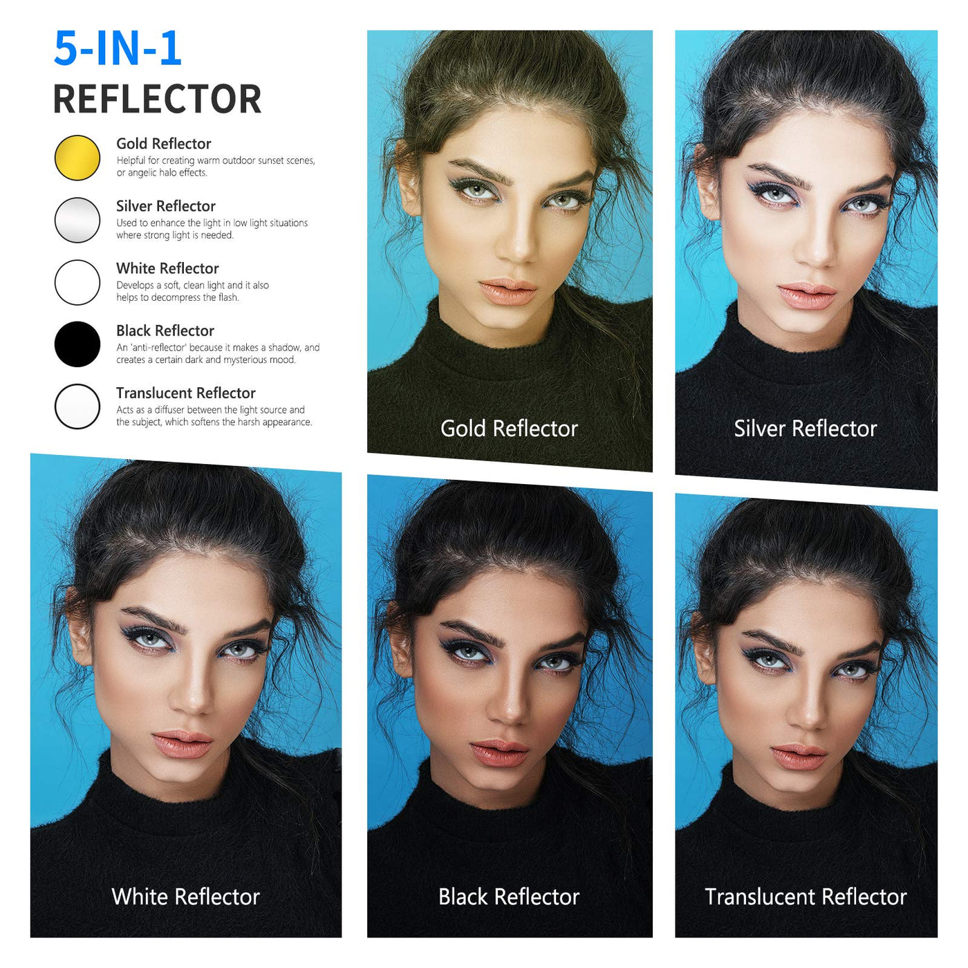 • Q: What are the different reflector colors included in the Neewer 5-in-1 reflector? A: The Neewer 5-in-1 Portable Round Reflector includes five different colors: gold, silver, white, black, and translucent. Each color serves a unique purpose in photography, allowing you to create various lighting effects.