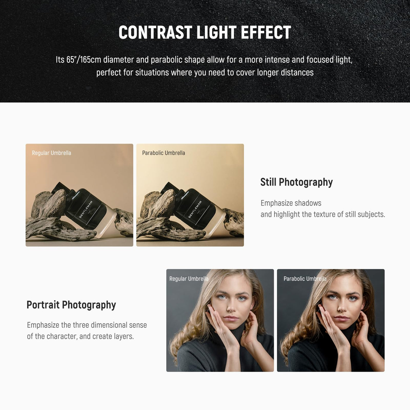 Q: What are the benefits of using the NEEWER 65" Parabolic Reflective Umbrella for photography?A: The NEEWER 65" Parabolic Reflective Umbrella provides enhanced light reflection, creating defined shadows and softer lighting effects. Its parabolic design allows for focused illumination, making it ideal for various photography needs such as portraits and product shoots.