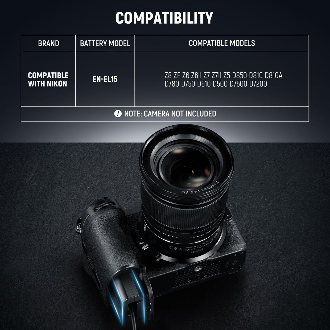 Compatible With Nikon Z8 Zf Z6 Z6Ii Z7 Z7Ii Z5 D850 D810 D810A D780 D750 D610 D500 D7500 D7200 Cameras That Accept En-El15 En-El15A En-El15B En-El15C Batteries. Works With All Neewer V Mount Batteries, Including Ps099E, Bp-95W, Bp-150Ws, Bp-190Ws, Bp-V47, And V Mounts Of Other Brands. More Battery Power And A Longer Continuous Runtime For Photography, Live Streaming, Video Conferencing, Vlogging, And Filmmaking. The Protection System Prevents Overcharging, Short Circuits, Overheating, Overcurrent, Overvoltage, And Other Possible Damages. Fully Decoded, No Warning Pop Ups. Specifications Model: Vp-Ep5B Dimensions: 2.2'' 1.5'' 0.8''/55 39 20Mm Weight: 2.3Oz/65G Wire Length: 6.6'/2M Min Output Voltage: 7.8V Max Output Voltage: 8.4V D-Tap Input Voltage: 9.6-20V D-Tap Input Current: 2A (Min) Output Current: 2A (Max) Continuous Output Current Maximum Output Current: =3A Output Protection Current: 3.8A-4.9A Operating Temperature: 32-113F/0-45C Storage Temperature: -4-140F/-20-60C Package Contents 1 X En-El15 To D Tap Dummy Battery X User Manual