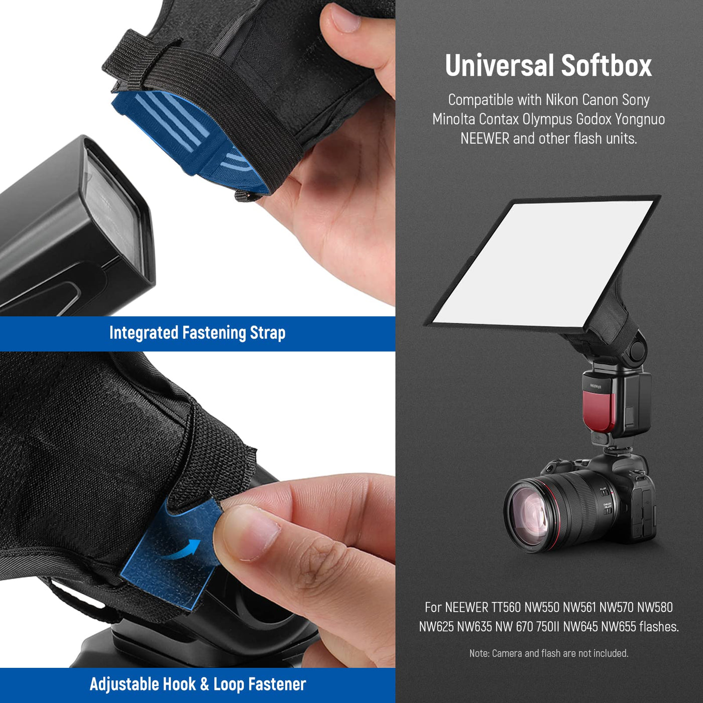 Professional Lighting Made Easy!This Portable And Versatile Softbox Is Designed For Speedlites And Flashes With A Hot Shoe. The Softbox Comes Standard With An Adjustable L Shaped Mounting Bracket Which Can Fit Practically Any Flash Unit. The Softbox Creates An Even Lighting That Allows You To Capture Perfect Shots By Diffusing The Flash. It Will Also Reduce Blemishes And Improve Skin Tone Contrast While Delivering Super Rich Coloring. It'S Everything You Need To Produce A Photography Studio On A More Professional Level.Convenient And Effectiveunfold The Diffuser And Attach The Front; You'Re Ready To Go! Stretch Opening Allows You To Connect The Diffuser To Most Shoe Mount Flashes.Compatible With:Nikon D7000 D5100 D5000 D3100 D3000 D700 D300 D300S D100 D90 D70 D70S D60 D40 D3 D3S D3X Sb-900 Af Sb-800 Af Sb-700 Af Sb-600 Sb-400 Af Canon G1X 600D 1D X Sx40 Hs Sx150 Is 60D 550D Sx30 Is G12 Sx130Isneewer Tt560 Tt520 Tt660 Nw680 Ttt850 Tt860 And Other Dslr Flashesspecificationsproduct Dimension: 9'' X 7'' / 22.9 X 17.9Cmmaterial: Black Nylon, Silver Pvcpackage Contents1 X Universal Softbox Diffuser For Shoe Mount Flashes (9'' X 7'')1 X Carry Pouch