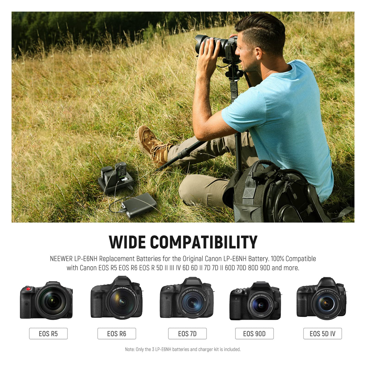 Neewer Lp-E6Nh Replacement Batteries Are Compatible With Canon Eos R5 Eos R6 Eos R 5D Ii Iii Iv 6D 6D Ii 7D 7D Ii 60D 70D 80D 90D Cameras And Other Devices Powered By Lp-E6Nh Battery. The Charger Is Compatible With Lp-E6Nh And Lp-E6 Li-Ion Battery Packs. Three 2250Mah Lp-E6Nh Batteries Offer Long Battery Life For Your Eos Camera And Are Easy To Carry In Your Bag. Charge 3 Batteries At The Same Time With The Triple-Slot Charger. Via The 5V 3A Usb Type-C Port, You Can Fully Charge 3 Batteries Together In 5 Hours. Usb Type-C And Usb-A Charging Ports Receive Power From Portable Chargers And Car Chargers For On-The-Go Charging. The Built-In Protection System Protects The Batteries From Overcharge, Over-Temperature, Over-Current, Over-Voltage, Electric Shocks, And Short Circuits. Specifications Lp-E6Nh Battery Voltage: 7.2V Battery Capacity: 16.2Wh, 2250Mah Battery Type: Li-Ion Rechargeable Battery Triple-Slot Charger Model: Tt-Lpe6 Input: 5V 3A Output: 8.4V 850Mah (X1) /650Mah (X2) / 450Mah (X3) Charging Time: 5 Hrs (3 Batteries), 4 Hrs (2 Batteries), 3 Hrs (1 Battery) Package Contents 3 X Lp-E6Nh Li-Ion Battery Pack 1 X Triple-Slot Battery Charger 1 X Usb Type-C Cable