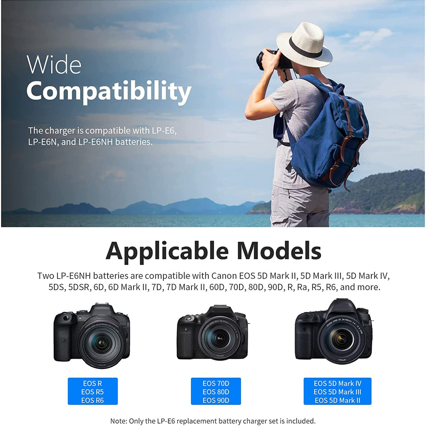 ?More Battery Power? The Lp-E6Nh Battery Charger Set Gives More Battery Power For On-Location Photography. Two 2250Mah Rechargeable Batteries Provide Longer Battery Life And Help You Take More Photos And Videos | ?Charge Through Usb? The Two-Channel Usb Charger Charges Two Batteries At One Time. The Provided Usb-C Cable Gets Power From Wall Chargers, Power Banks, Car Chargers, And Your Computer. The 8.4V/1A Input Ensures Batteries Will Get Fully Charged In A Few Hours | ?Backlit Lcd Screen? The Backlit Lcd Screen Tells You About The Charging Status Of Each Battery, Including Charging Progress, Charging Current, Charging Voltage, And Charging Capacity | ?Reliable & Portable? With A Built-In Protection System, The Charger Can Effectively Prevent Overheating, Over-Charging, And Short-Circuit. Light And Compact, This Battery Charger Set Can Fit Inside Your Bag And Travel Around With You | ?Wide Compatibility? Batteries Are Compatible With Canon Eos 5D Mark Ii, 5D Mark Iii, 5D Mark Iv, 5Ds, 5Dsr, 6D, 6D Mark Ii, 7D, 7D Mark Ii, 60D, 70D, 80D, 90D, R, Ra, R5, R6, And More. The Charger Charges Lp-E6, Lp-E6N, And Lp-E6Nh Batteries