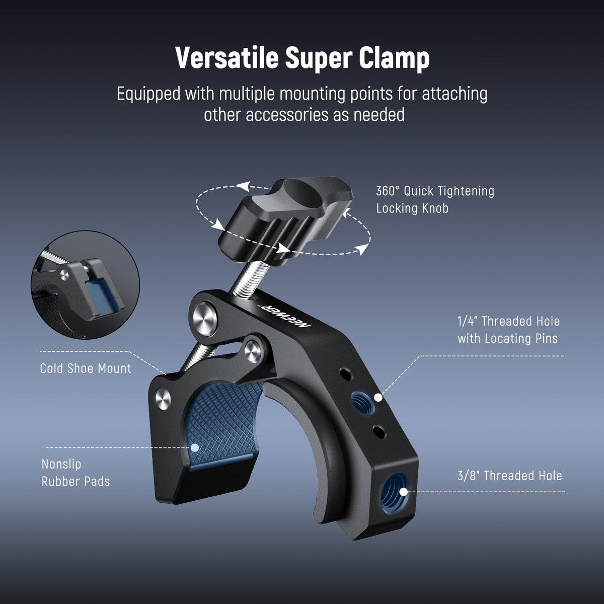 Neewer Super Clamp With Cold Shoe And Threaded Holes 1/4'' 3/8'', Max Load 2Kg, Crab Shaped Clamp Holder For Most Photography Ac
