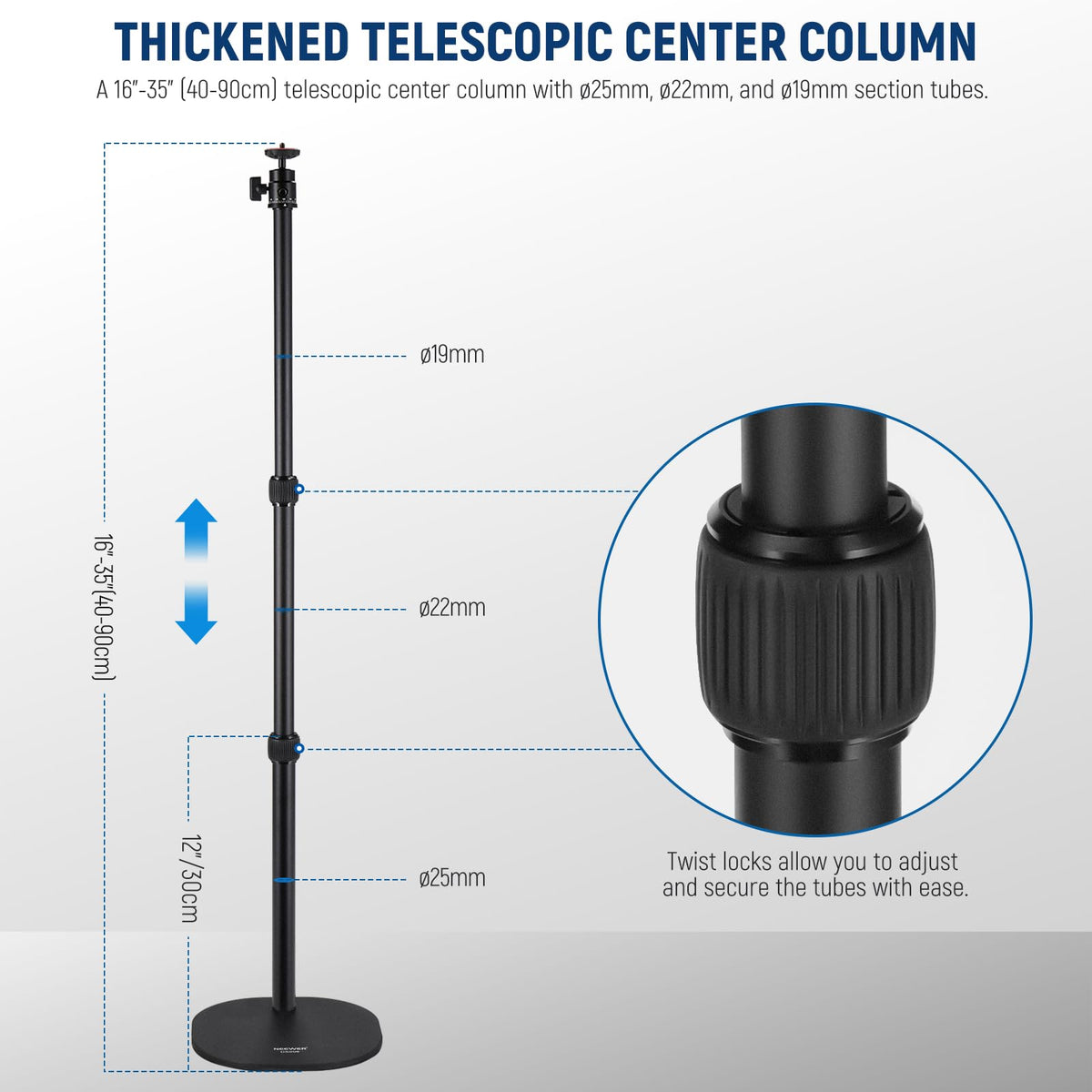 Neewer Ds006 Desktop Stand Features A Heavy Base For Remarkable Stability And A Telescopic Center Column That Offers A 16''-35'' (40-90Cm) Height Range-Optimal For Live Streaming, Photography, Online Teaching, Video Calls, And Makeup Tutorials. The Ball Head Is 360 Rotatable, 90 Tiltable, And Has A 360 Pan Base For Panorama Photography. The 1/4'' Screw Fits A Wide Variety Of Devices, Such As Projectors, Dslr Cameras, Action Cameras, Ring Lights, And Led Video Lights. A Phone Holder Is Included. Extendable From 2.5'' To 4.1'' (6.4 To 10.5Cm), It Is Compatible With Iphone 15 Pro Max 14 Pro Max 14 Plus 13 Pro Max 13 Mini 12 X Xs Max Xr Samsung Galaxy S23 S22 Ultra Huawei P60 Pro Mate 60 Google Pixel 7 Pro, Etc. The Solid And Robust Black Anodized Aluminum Alloy Construction Gives This Stand A Vertical Load Capacity Of 11Lb (5Kg) And A Horizontal Load Capacity Of 3.3Lb (1.5Kg). Specifications Model: Ds006 Material: Aluminum Alloy, Iron Height Adjustment: 16''-35''/40-90Cm Base Size: 11''X11''/28X28Cm Load Capacity: 11Lb/5Kg (Vertical), 3.3Lb/1.5Kg (Horizontal) Weight: 3.5Lb/1.6Kg Package Contents 1 X Weighted Base 1 X Telescopic Center Column 1 X Panoramic Ball Head 1 X Phone Clamp 1 X Action Camera Mount 1 X 1/4'' Screw To 5/8'' Stud Adapter 1 X User Manual