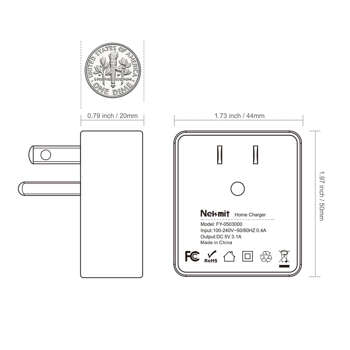 Q: What are the dimensions of the Nekmit Charger?A: The Nekmit Dual Port Charger has a compact size of 2 x 2 x 0.7 inches, making it ultra-slim and easy to use in tight spaces, such as wall sockets that are hard to reach.