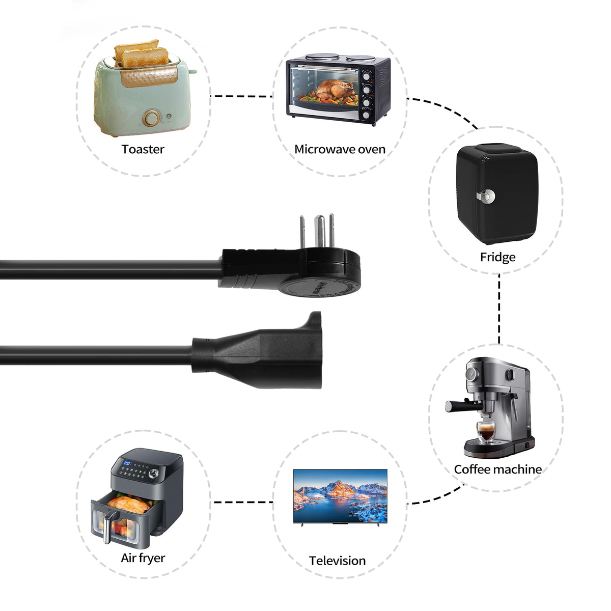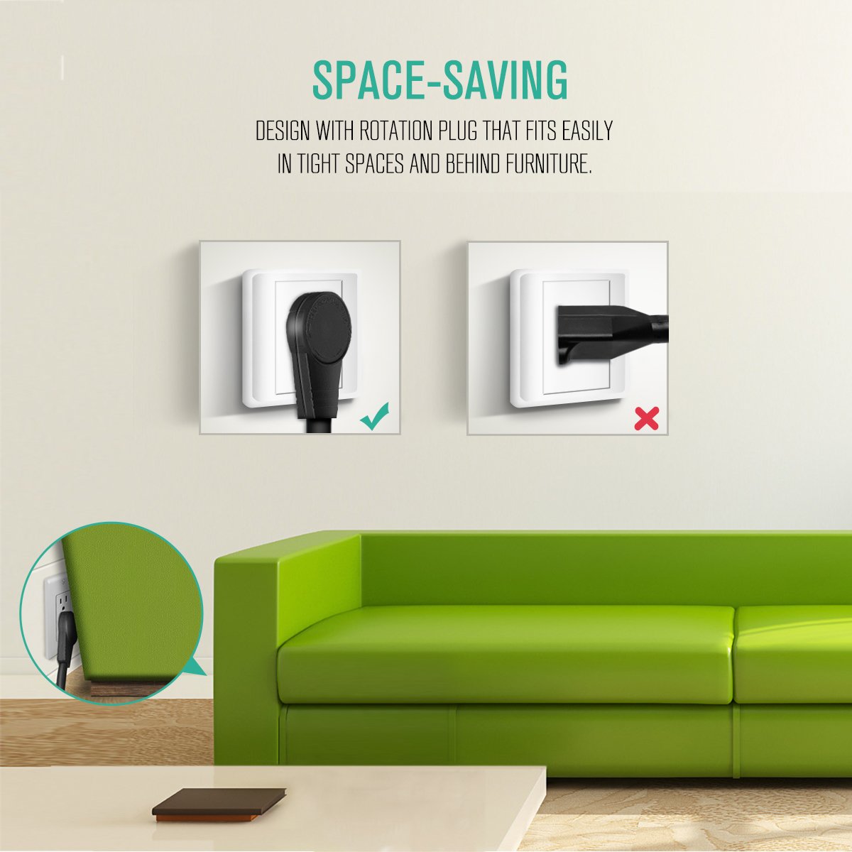Q: Can I rotate the plug to fit in tight spaces?A: Absolutely! The extension cord features a 360° rotating flat plug that allows you to adjust the plug to fit snugly against walls or furniture without damaging it.