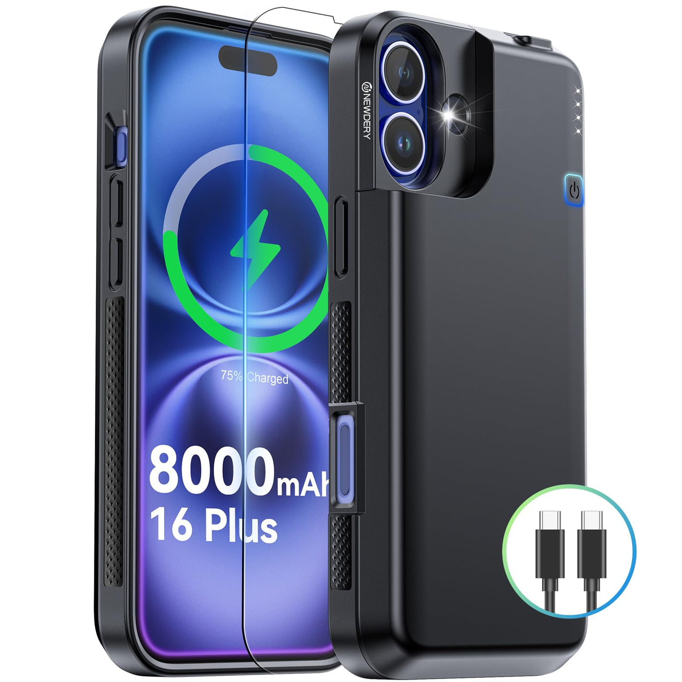 Newdery Upgraded Battery Case For Iphone 16 Plus, 8000Mah Usb C Portable Power Bank, Carplay, Sync-Data Supported, Rechargeable