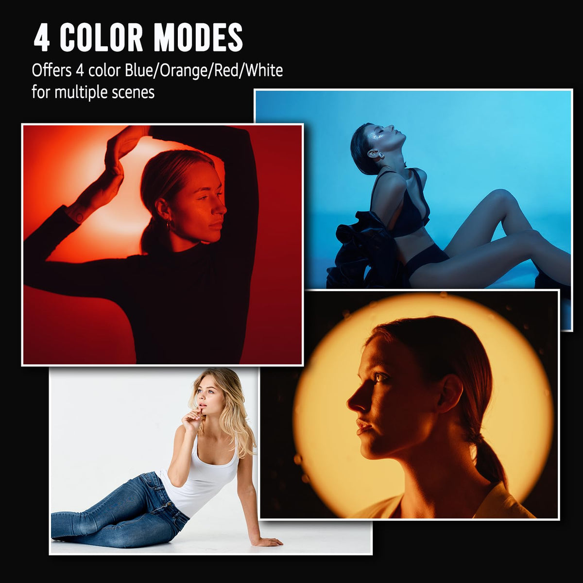 ?Powerful Lighting With 4 Color Modes?This Led Photography Light Has 10W Powerful Output. Features 4 Color Modes Of Orange, Blue, White And Red. Simply Press The Power Button One Time To Change The Lighting Color. Providing Different Lighting Atmosphere For Your Create. Brightness Adjustable In A Range Of 10%-100% Infinitely. Sliding The Front End Of Light To Control The Aperture As You Need. Get Customized Lighting For Your Working. | ?Detachable Diffusion?This Video Light Set Is Equipped With A Detachable Silicone Diffusion. Work With The Diffusion Can Generate Large-Area Diffuse Reflection Of Light, Providing Soft And Uniform Ambient Light. Work Without The Diffusion To Converge The Light Into An Aperture, Creating A Strong Contrast Background Light That Enhances The Creativity Of The Work. Provide More Lighting Effects Options For Your Creations. | ?Portable Size ?With A Convenient Size Of 5.5