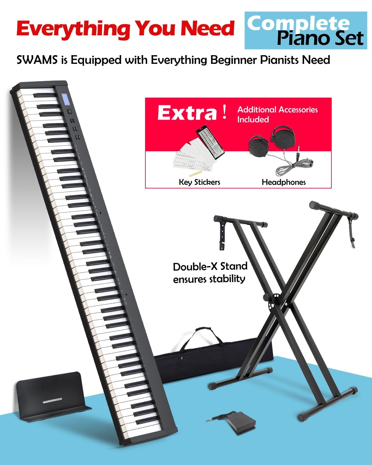 Equipped With 88 Semi-Weighted Touch-Sensitive Piano Keys That Provide An Authentic Playing Experience. The Piano Keyboard Comes With An All-In-One Package, Which Includes A Sturdy Stand, A Music Rest, Headphones, A Power Supply, Piano Stickers, And A Carrying Case For Easy Transport. Not Only Does This Piano Keyboard Offer Exceptional Touch And Sound Quality, But It Also Boasts A Wide Range Of Multifunctional Features. You'Ll Have Access To 128 Different Tones And Rhythms, 20 Demo Songs, Split, Record/Play, And More. Connect Your Headphones For Private Practice Or Use The Sustain Pedal For Sound Sustain Effect. You Can Even Connect Via Bluetooth And Use The Keyboard As A Speaker Or Connect Via Midi And Use A Piano App For Self-Learning Or Editing. The Portable And Lightweight Design Of Our Piano Keyboard Makes It Easy To Transport, Whether You'Re Traveling To A Gig Or Simply Moving It Around Your Home. The Included Carrying Case Ensures Your Keyboard Is Protected During Transportation. Overall, Our Piano Keyboard Offers Exceptional Quality, Versatility, And Portability, Making It A Fantastic Choice For Beginners And Professionals Alike.