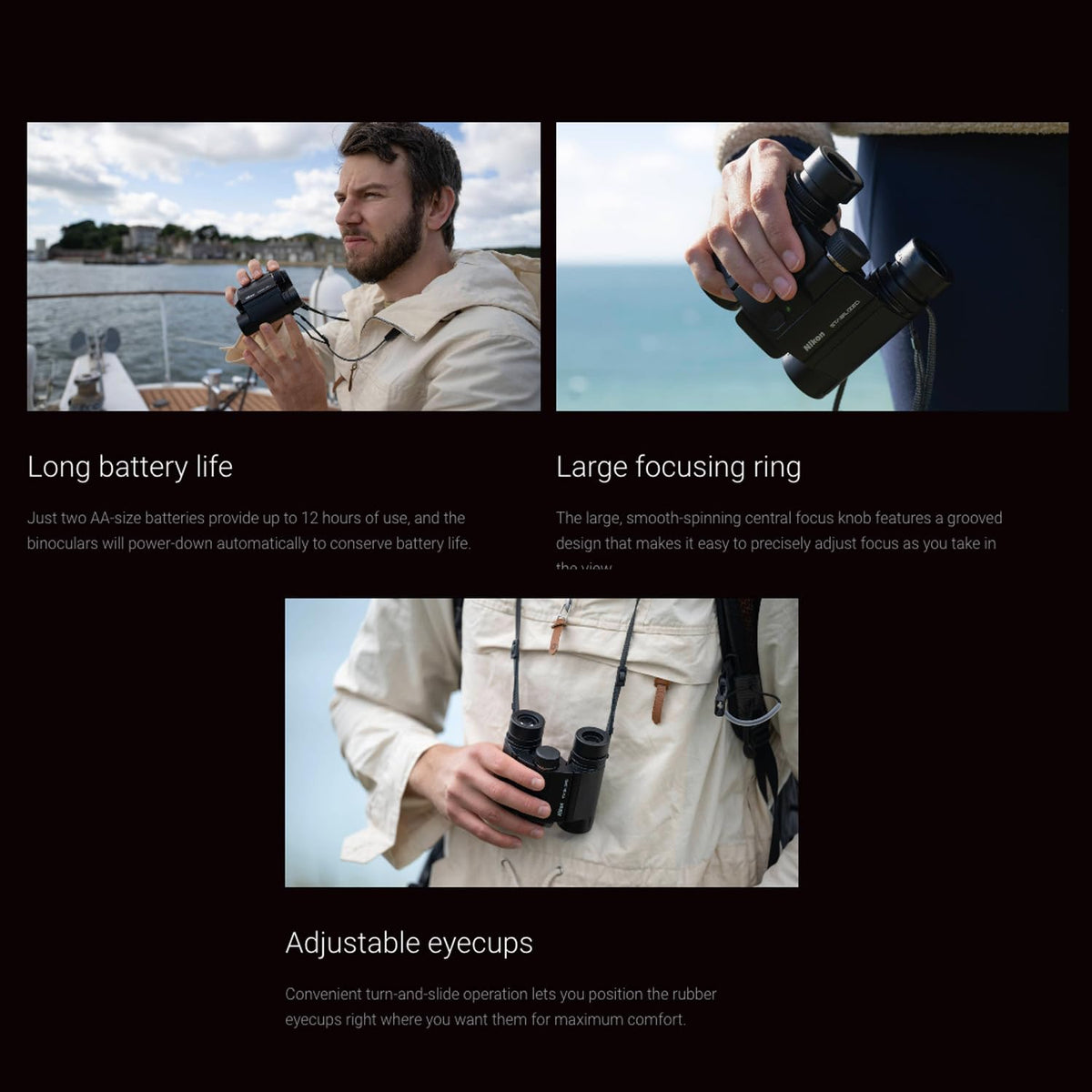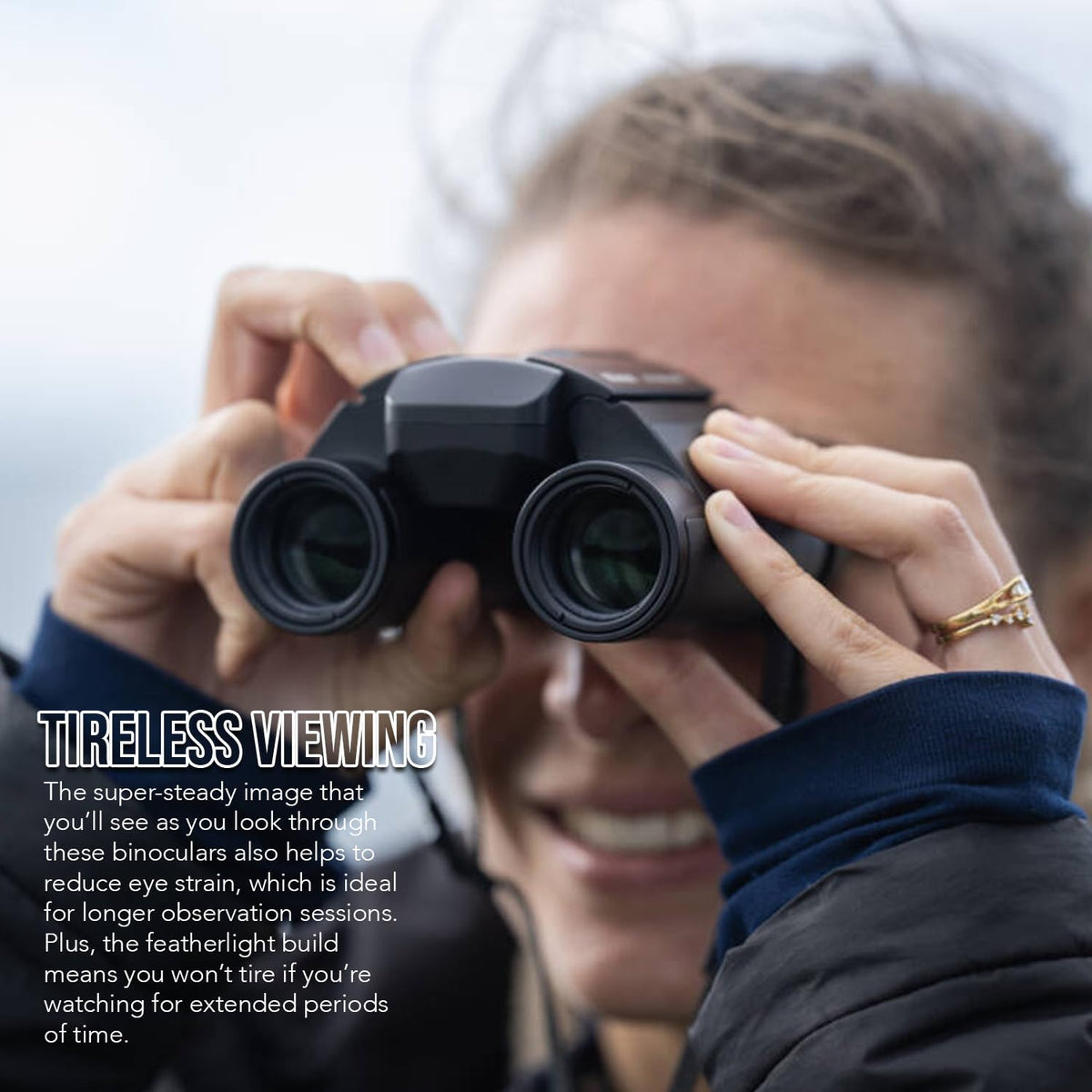 Nikon 10X25 S Dual-Hinge Design Stabilized Binoculars With Multilayer Lens Coatings (Black)The Nikon 10X25 S Dual-Hinge Design Stabilized Binoculars Helps You Get Incredibly Smooth, Steady Views Of Wildlife, Concerts, And Sporting Events. Observe For Longer As Less Image Shake Means Less Eye Fatigue, And That Means You Can Spend More Time Enjoying The Beautiful View. Central Focus Knob Is Comfortable And Intuitive For Quick, Precise Focus Adjustments. Personalize Your Eye Relief, Even When Wearing Glasses Through Adjustable Eyecups.Versatile 10X Magnificationa Great Balance Of Close-Up Power And Wider Field-Of-View (Fov). Ideal For Birding, Hiking In The Woods, Spectator Sports And Live Performances.Optical Image Stabilization10X25 Stabilized Binoculars Reduce The Blur And Eye Strain Caused By Image Shake. Nikons Original Stabilization System Counteracts Motion Before It Ever Reaches Your Eyes, For A Clear, Smooth View. Activate Stabilization Once And It Will Remain On For Up To 60 Minutes So You Can Spend More Time Enjoying The View.Compact And Lightweightthe Binoculars Look And Feel Like Traditional Compact Binoculars. Their Dual-Hinge Body Is Comfortable To Hold, Easy To Adjust And Foldable To Fit In A Pocket.Superb Nikon Opticsnikons Multilayer Lens Coatings Cut Through Glare For Outstanding Clarity And High Contrast. A Silver-Alloy Coating On The Prisms Delivers More Light To Your Eyes For A Bright View With Vibrant Colors.Long Battery Lifetwo Aa Batteries Provide Up To 12-Hours Of Stabilization. You Can Also Use The Binoculars With Stabilization Turned Off.Bundle Includes:Nikon 10X25 S Dual-Hinge Design Stabilized Binoculars (Black)Focus Camera Binocular Harnessfocus Lens Cleaning Pen