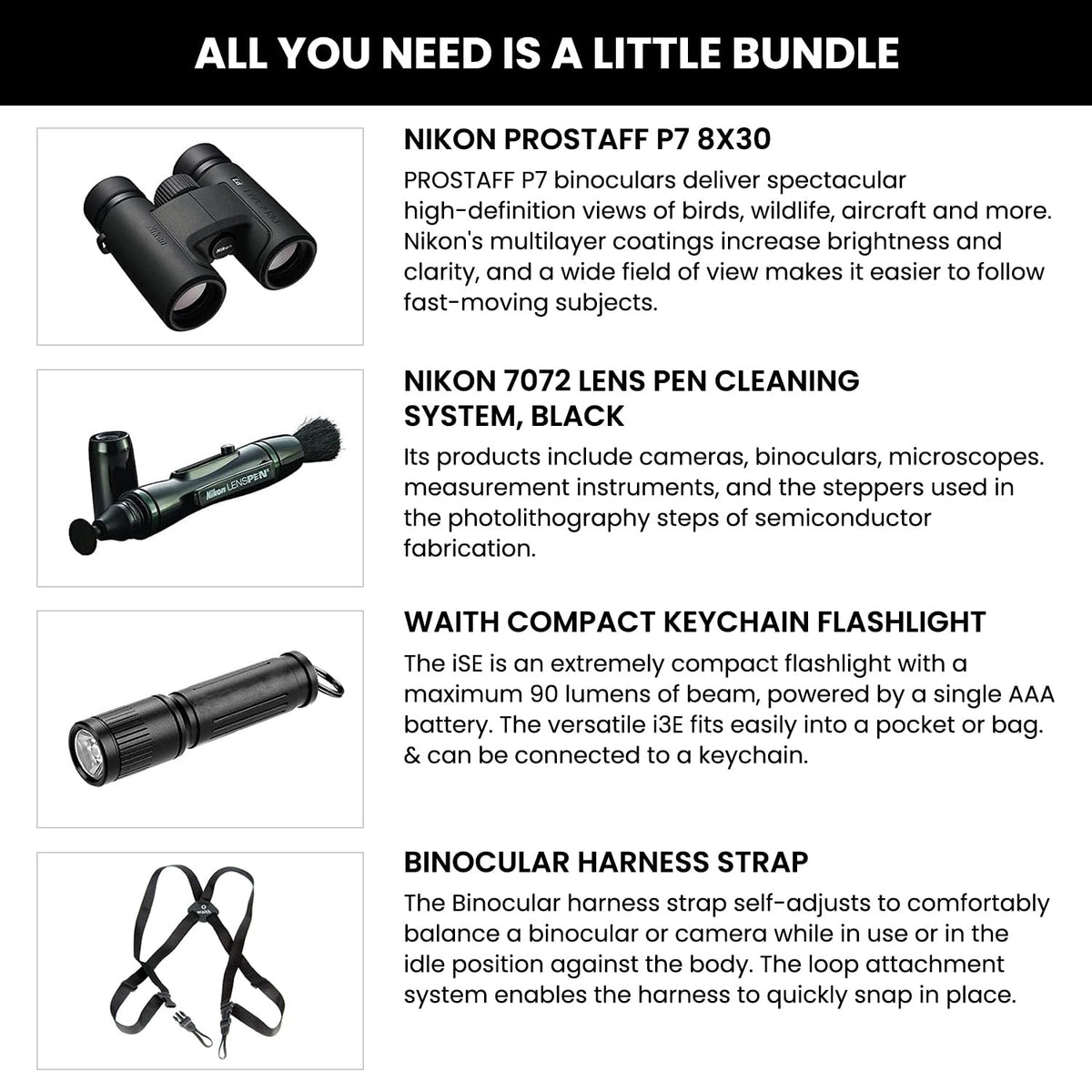 ≪P≫The Prostaff P7 8X30 Is Fitted With Top-Notch Installations And Attachments Enabling You To Use The Binocular At Any Time. The Nikon Binoculars Are Built With 8X Magnification Power And Wide Viewing Angles. The Glasses Use In The Binocular Ed Glass.Benefits: Nikon&Amp;Rsquo;S Multilayer Coatings Wider Views Higher Definition Brighter, Sharper Colors Waterproof Down To 3.3 Ft The Locking Diopter Ring Keeps Your Setting Eco-Friendly Glass Non-Stick Coating For Easy Cleaning Lenses That Won&Amp;Rsquo;T Fog Lightweight, Comfortable And Tough Turn-And-Slide Eyecups Long Eye Relief Tough Skinned Hard Bodied Product Details Of Nikon Prostaff P7 8X30: Focusing System: Central Focus Magnification: 8X Objective Diameter: 30Mm Angular Field Of View (Real): 8.7&Amp;Deg; Angular Field Of View (Apparent): 62.6&Amp;Deg; Fov At 1000 Yds: 456 Ft. Close Focus Distance: 8.2 Ft. Exit Pupil: 3.8Mm Relative Brightness: 14.4 Eye Relief: 15.4Mm Size (Length X Width): 4.9 X 5.1 In. Weight: 17.1 Oz. Phase Coating: Yes Dielectric Coating: Yes Waterproof/Fogproof: Yes Prism: Roof Locking Diopter: Yes Oil &Amp;Amp; Water Repellent Coating: Yes Product Details Of Binocular Harness Strap: Item Dimensions Lxwxh: &Amp;Lrm;1X5X3'' Item Weight: &Amp;Lrm;1.59 Ounches Color: &Amp;Lrm;Black Material: &Amp;Lrm;Nylon Product Details Of Lens Pen Cleaning System: Product Dimensions: 6 X 3 X 1 Inches Item Weight: 0.5 Ounces Cleaning Tip: Non-Liquid Compound, Retractable Soft Brush Product Details Of 90 Lumens Waith Flashlight: Light Source: High-Performance Led Lens: Pmma Tir Lens (Delivering Homogenous Light) Max Lumens: 90 Lumens Beam Distance: 44M Runtime: 60 Minutes (Pro-900Mah Nimh Battery); 35 Minutes (Aaa Green Max Alkaline Battery) Peak Beam Intensity: 500Cd Dimension: Head 14Mm Length 60.5Mm Weight: 7.9G / 0.28Oz(Excluding Battery)≪/P≫