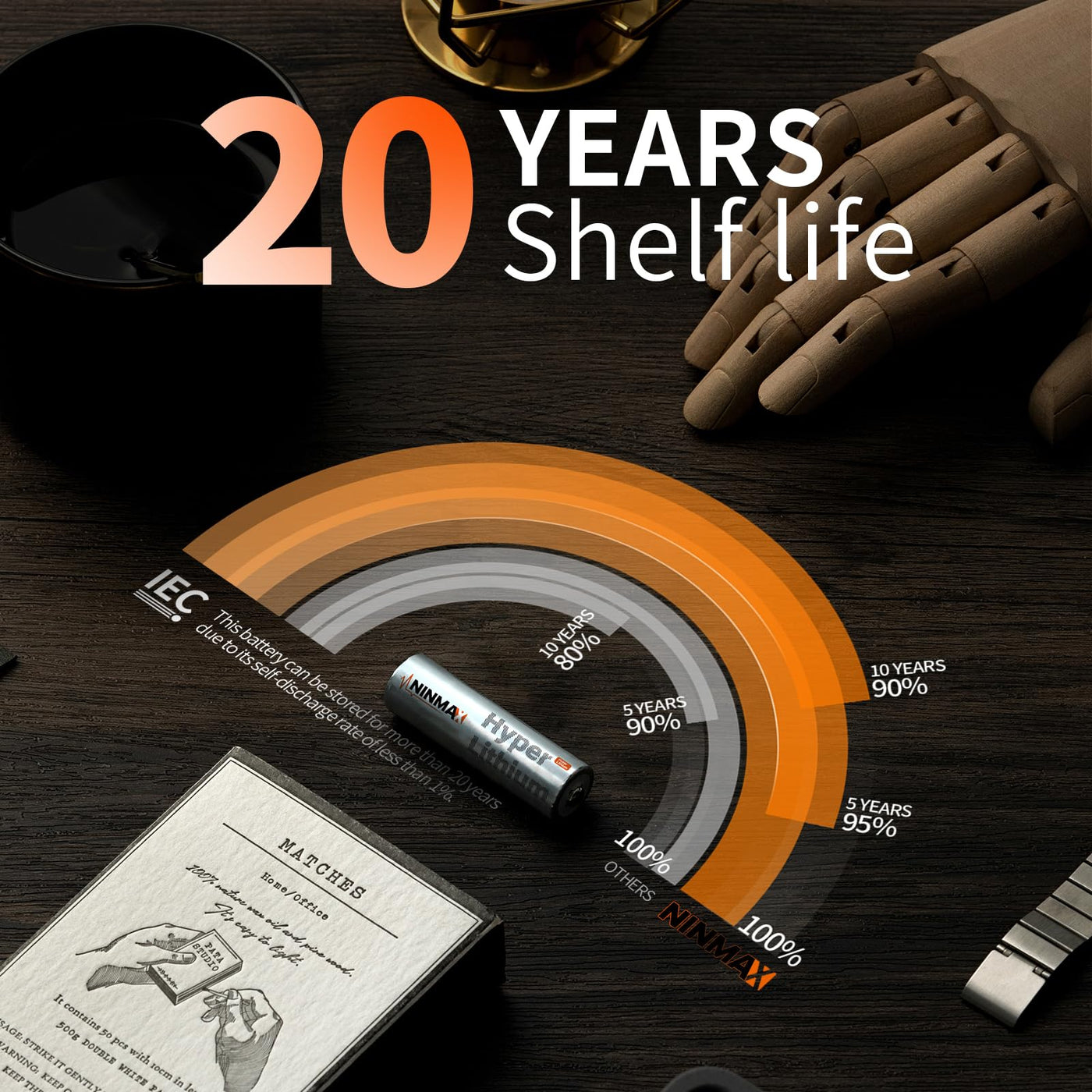 Q: What is the shelf life of NINMAX Lithium AA Batteries?A: The shelf life is twenty years. This long storage time ensures you have reliable power when you need it most.
