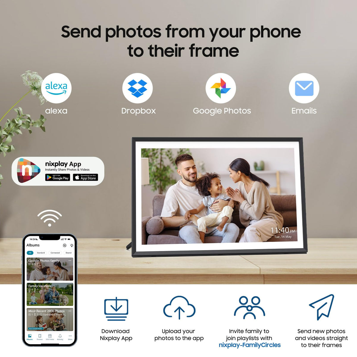 Q: How do I set up the Nixplay digital picture frame?A: Setting up the Nixplay digital picture frame is incredibly easy. Simply download the Nixplay app available for both Android and iOS, follow the in-app instructions to connect your frame to WiFi, and invite family and friends to upload photos. You can also log in via the desktop web app or email photos directly to your frame.