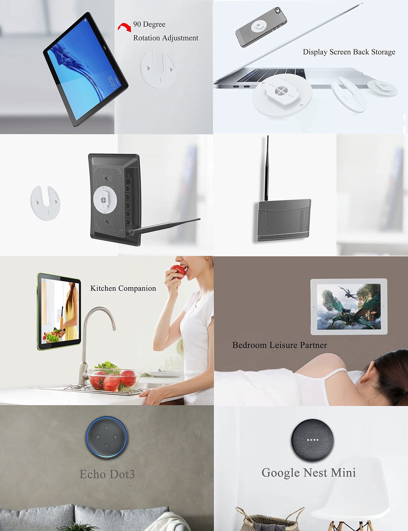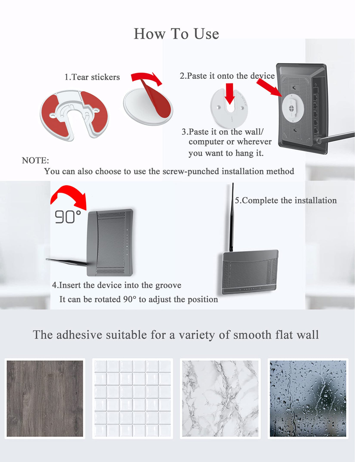 Howto Use: A.Strongadhesive Fixed Installation. The Top Cover Of The Holder (Round Part) Is Pasted To The Deviceand The Base Of The Holder (Grooved Part) Is Pasted To The Wall/Computer Or Wherever You Want To Hang It. Insert The Device Into The Groove. You'Ll Hear Aclick, Which Means It'S A Perfect Combination ,It Can Be Rotated 90To Adjustthe Position. B.Screw Mounting. Drill The Wall And Fix The Grooved Base With Screws. C.Packing List: 2*Holder/6*Special-Shaped Adhesive/3* Round Adhesive. D.Note: If Installed With Adhesive, After Installation, Please Wait For 48 Hours Before Starting To Hang Items, This Will Make The Adhesive Stronger, This Is The Properties Of Adhesives,Bearing Less Than3 Pounds.