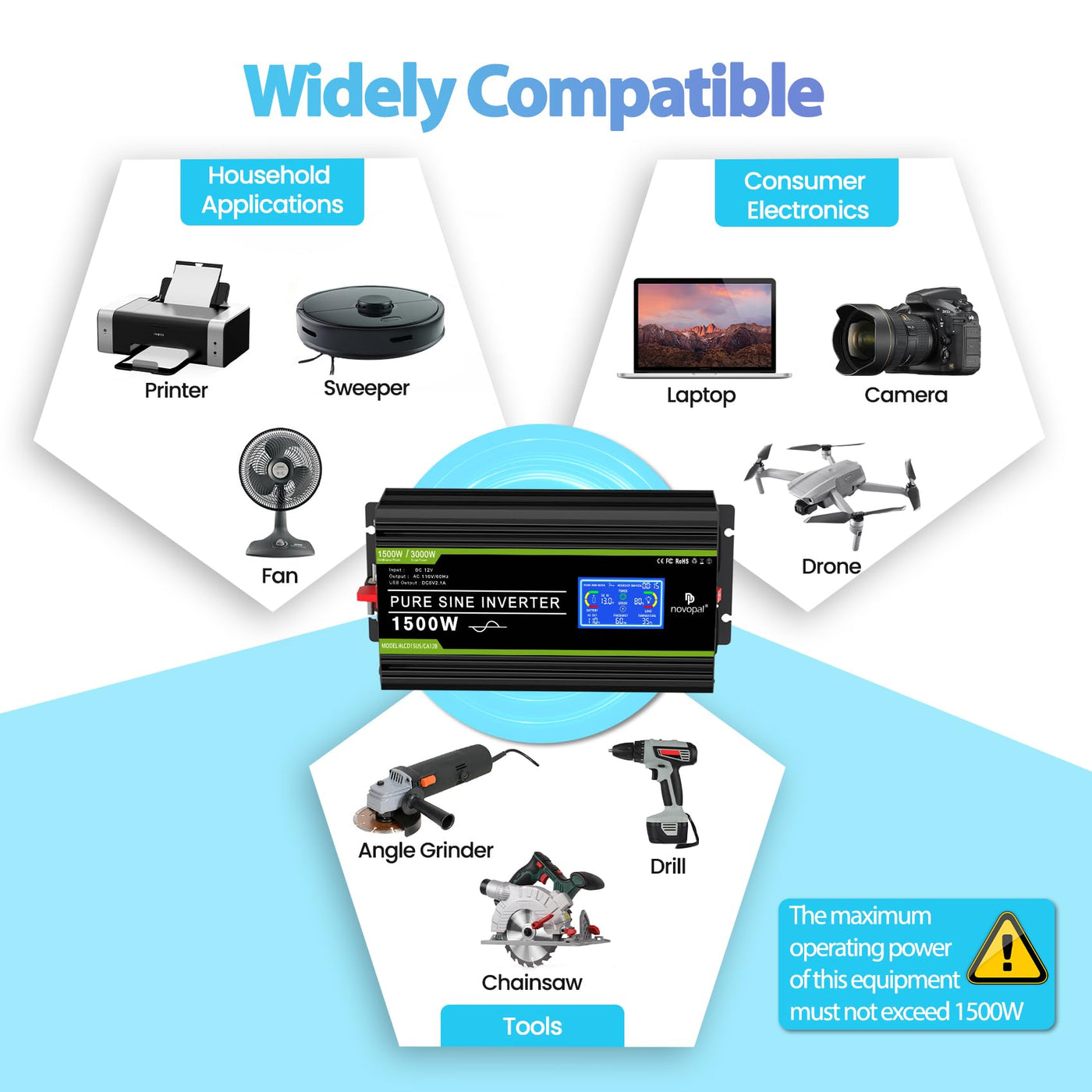 Novopal 1500 Watt Pure Sine Wave Power Inverter Dc 12V To 110V/120V Converter 4 Ac Outlets Car Inverters With Usb Port 16.4 Feet