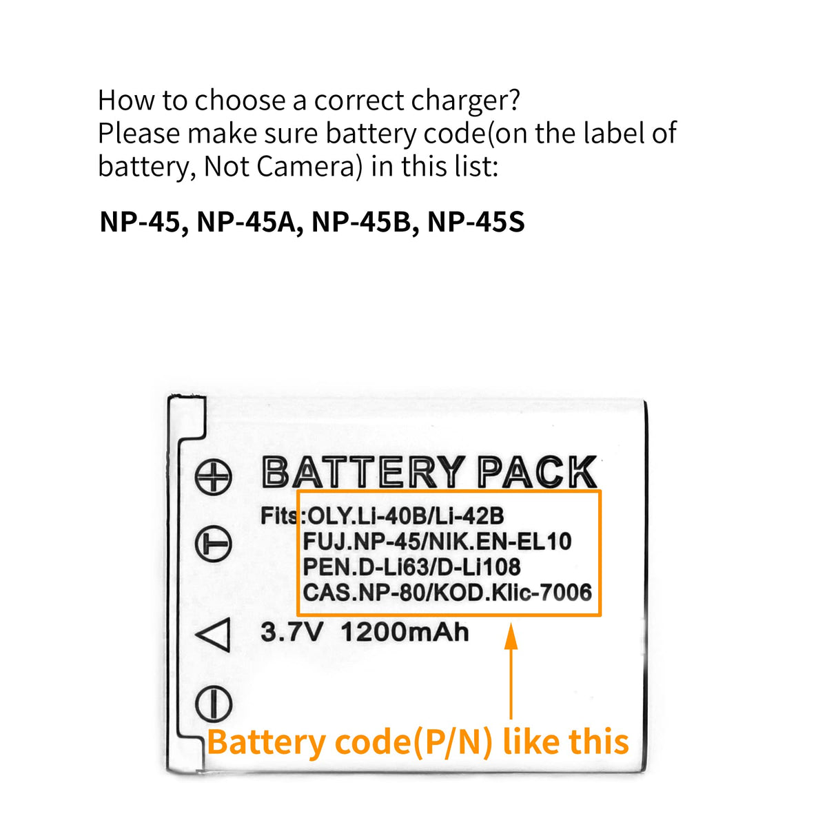 Q: What cameras are compatible with the NP-45 Charger?A: The NP-45 Charger is compatible with a wide range of Fujifilm cameras, including models such as FinePix J10, JX250, JX400, JV200, and many more. Ensure that your battery model is listed as NP-45, NP-45A, NP-45B, or NP-45S for proper compatibility.