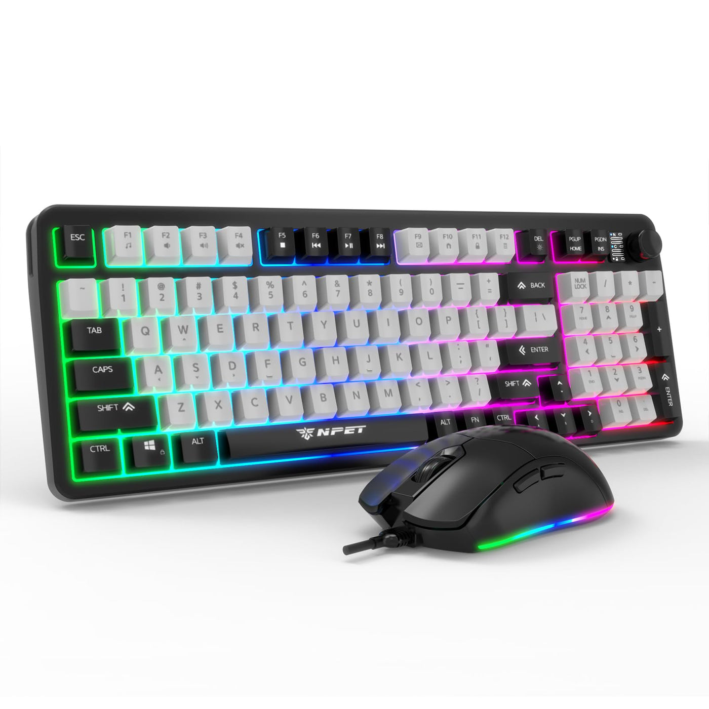 NPET Wired Keyboard and Mouse Combo, 98 Keys Mechanical Feel Quiet Membrane Keyboard with Knob, Double-Shot Keycaps, Spill-Resis