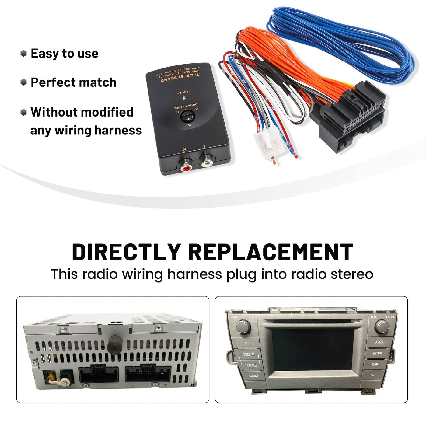 Q: How does the line output converter work with my factory radio?A: The line output converter converts the audio signal from your factory radio to a level suitable for an external amplifier. It allows you to connect an amplifier or subwoofer to your OEM car radio system, enhancing your audio experience without interference.