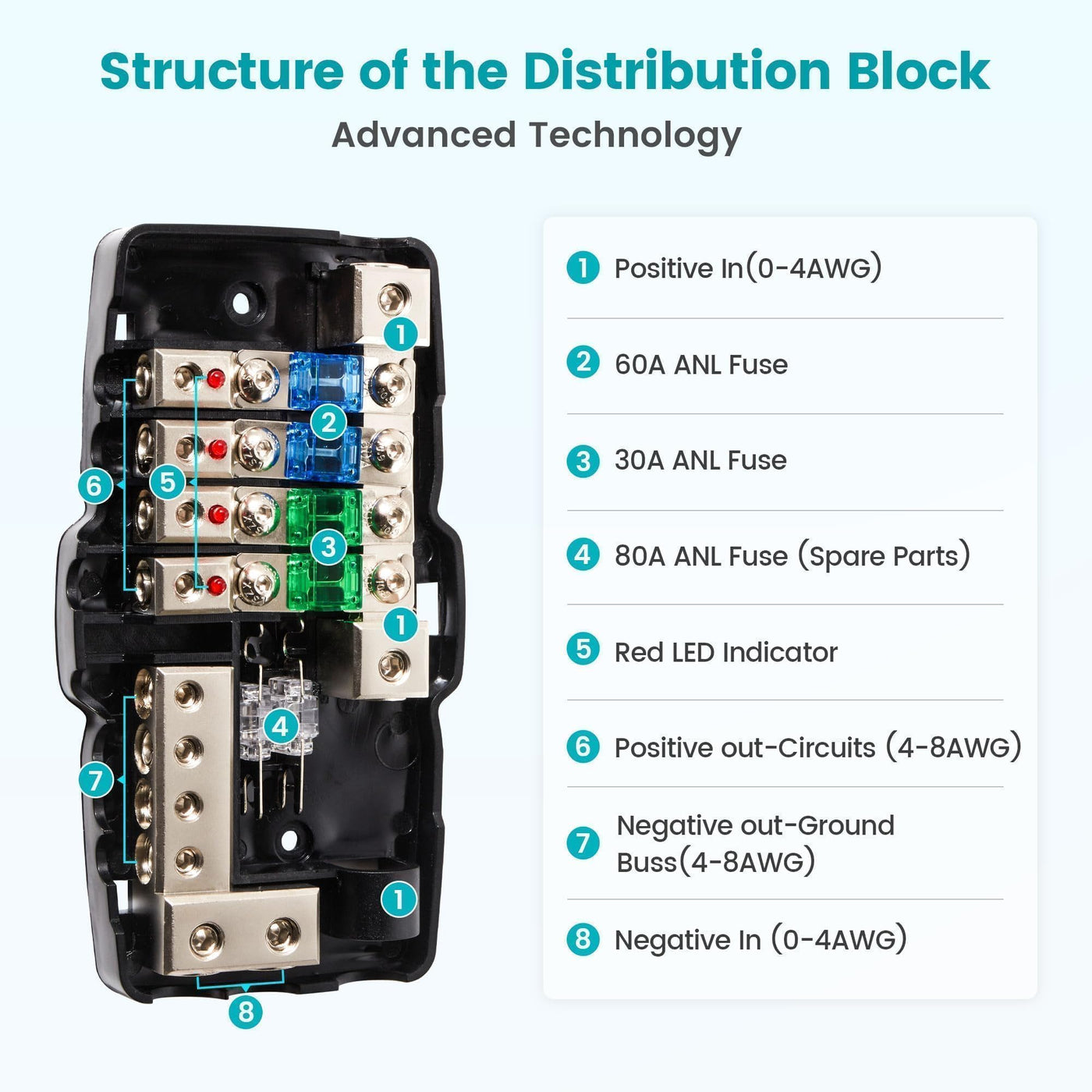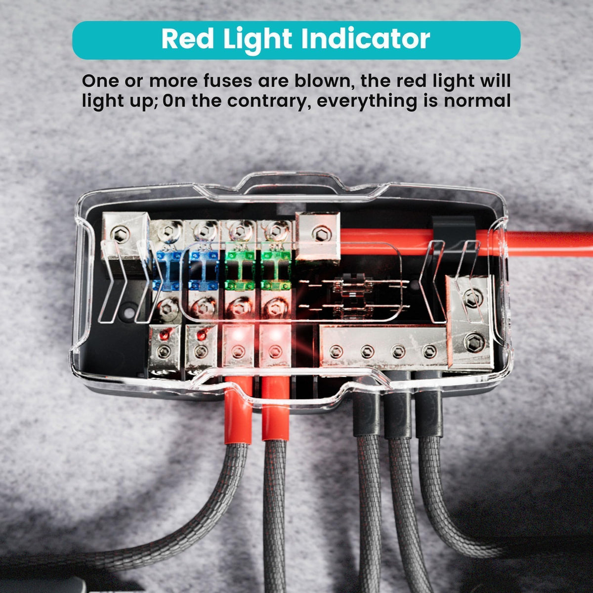 Dual Anl Fuse Holder Distribution Block Used To Connect The Audio Power Cable To The Audio System To Prevent Excessive Current And Fuse Block Automatically Cut Off When The Current Is Too Strong. When One Or More Fuses Are Blown, The Red Light Will Light Up And Help You Identify The Status Of The Fuse. Fused Distribution Block 2 In 4 Out Include 6 Mini-Anl Fuses. 4 Way Fuse Block Is Universal For Car, Boat, Rv Or Other Vehicles.