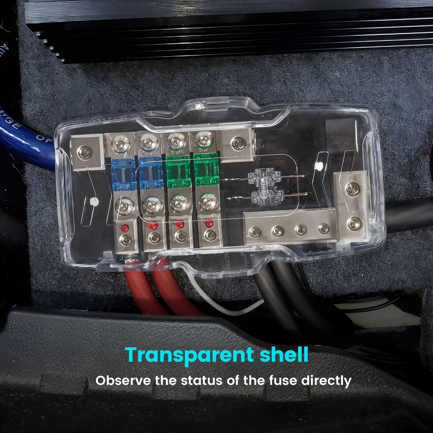 Q: Is the NuIth power distribution block durable and safe to use?A: Yes, the NuIth power distribution block is designed with durability in mind. It features a high-quality plastic construction that is heat resistant and flame retardant, along with a transparent shell for easy monitoring of fuse status. This ensures reliability and safety in your audio installations.