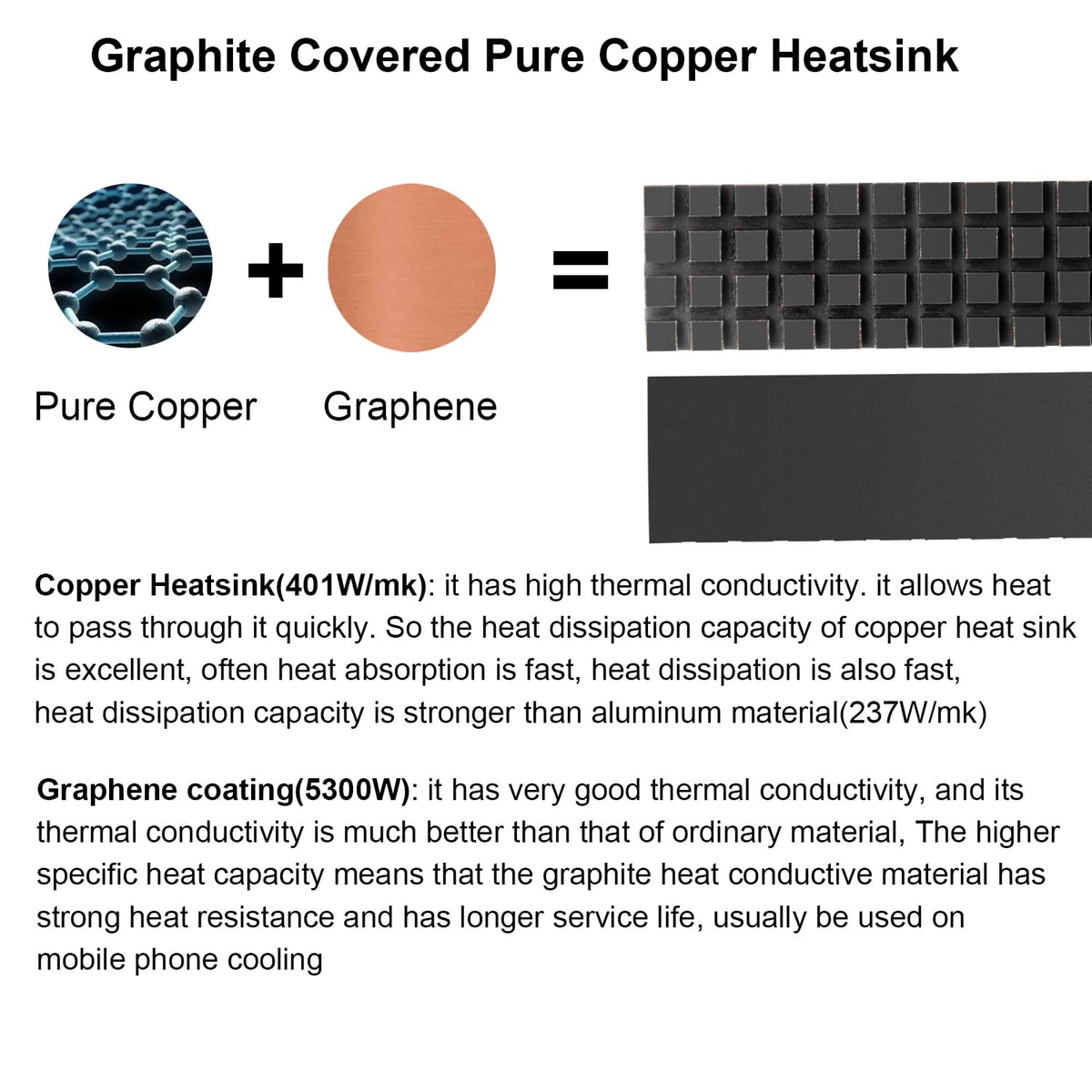 Q: What materials are used in this heatsink?A: The heatsink is made of pure copper, which has excellent thermal conductivity, while the graphite cover enhances its heat dissipation properties.
