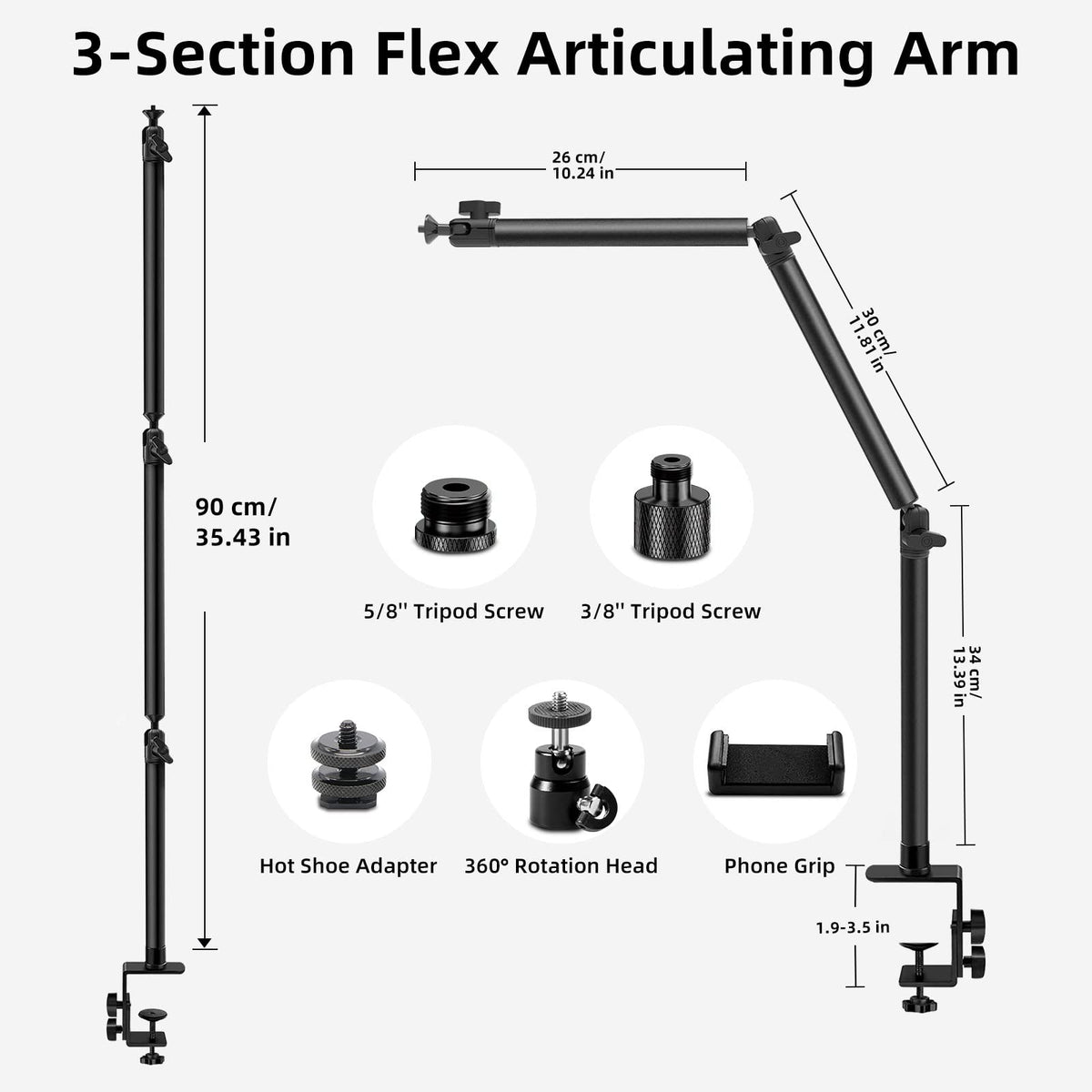 Q: How adjustable is the height of the desk mount stand?A: The desk mount stand is highly adjustable, with a height that can be extended from 13.39 inches to 35.43 inches. This flexibility allows you to set the desired height based on your specific needs for photography or streaming.